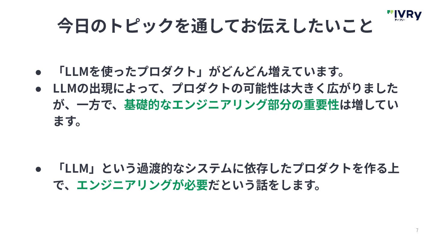 7 今⽇のトピックを通してお伝えしたいこと • 「LLMを使ったプロダクト」がどんどん増えています。 • LLMの出現によって、プロダクトの可能性は⼤きく広がりました が、⼀⽅で、基礎的なエンジニアリング部分の重要性は増してい ます。 • 「LLM」という過渡的なシステムに依存したプロダクトを作る上