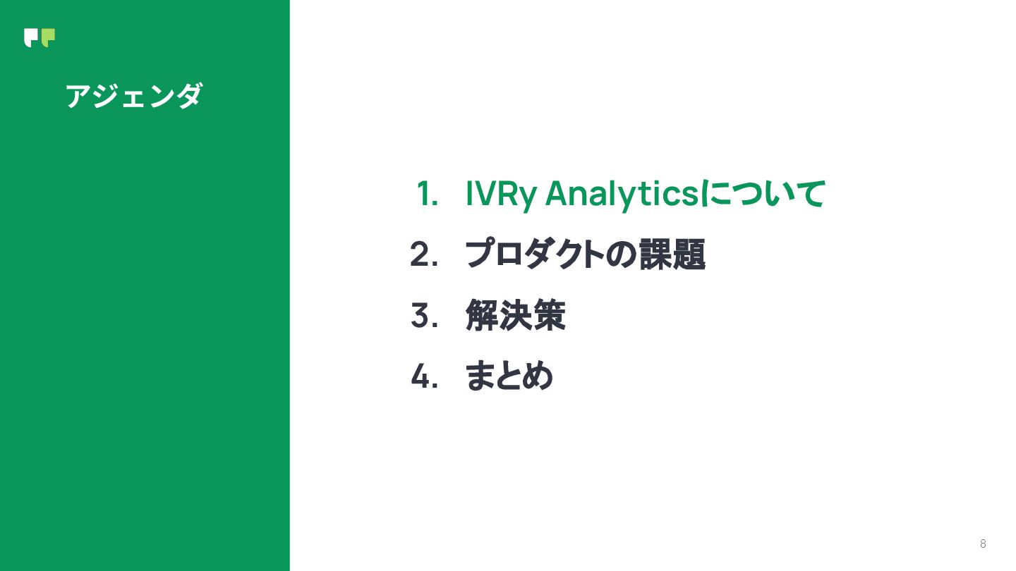 8 1. IVRy Analyticsについて 2. プロダクトの課題 3. 解決策 4. まとめ