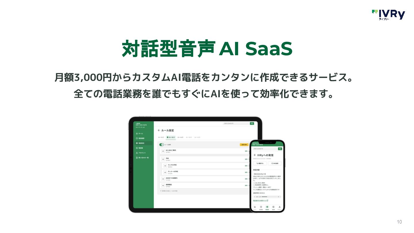 対話型音声 AI SaaS 月額3,000円からカスタムAI電話をカンタンに作成できるサービス。 全ての電話業務を誰でもすぐにAIを使って効率化できます。 10