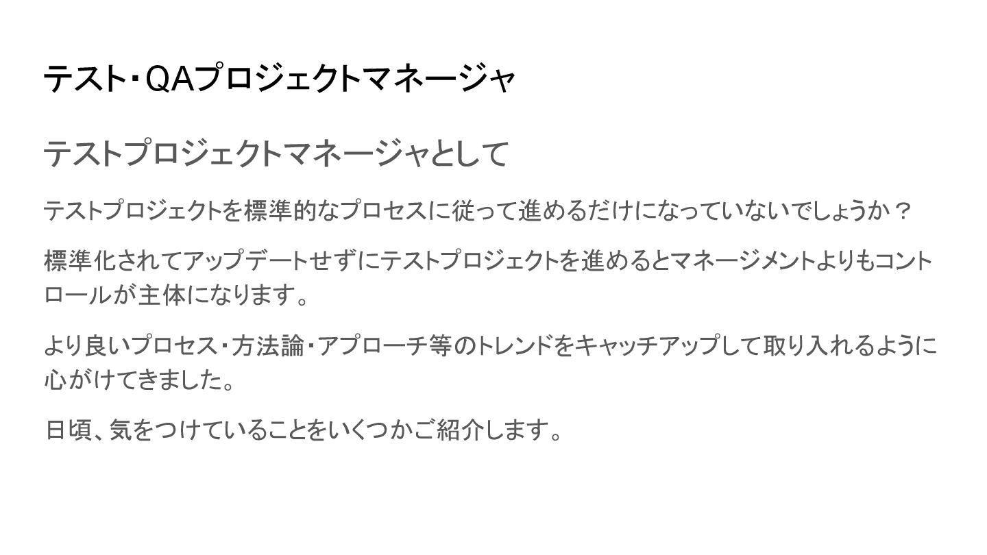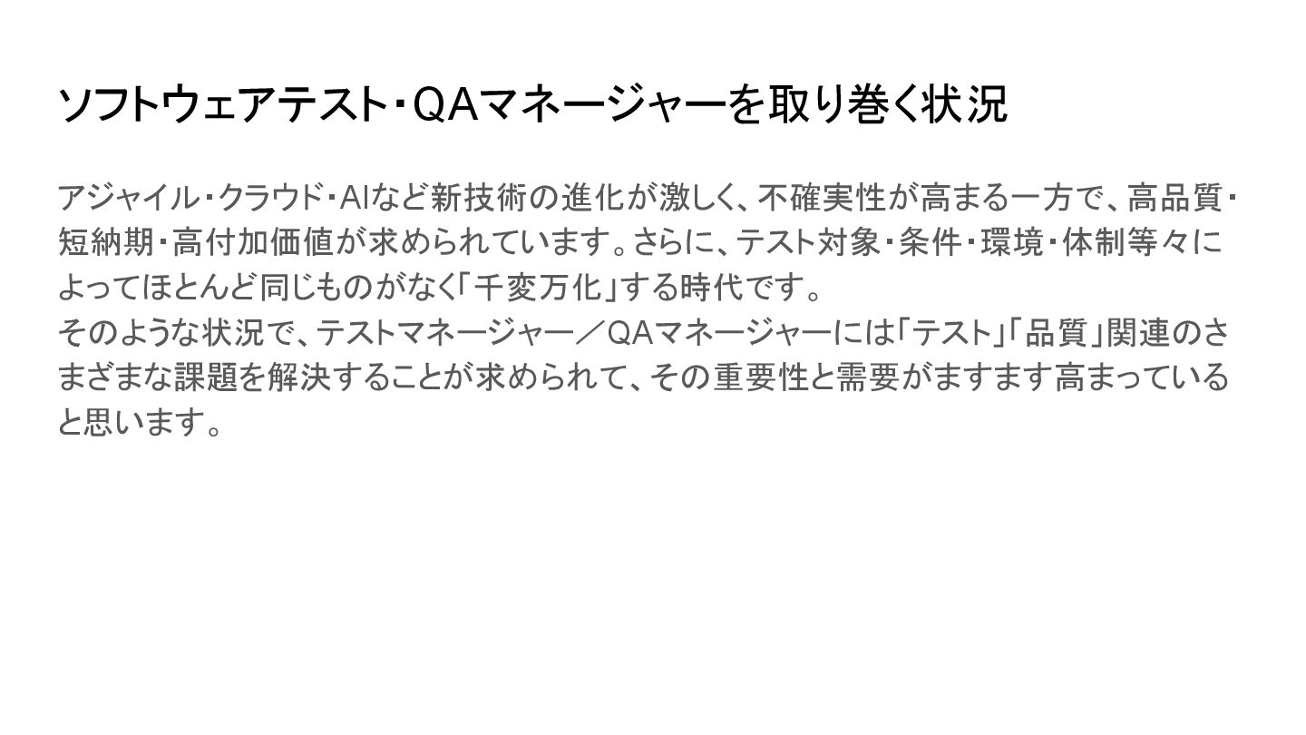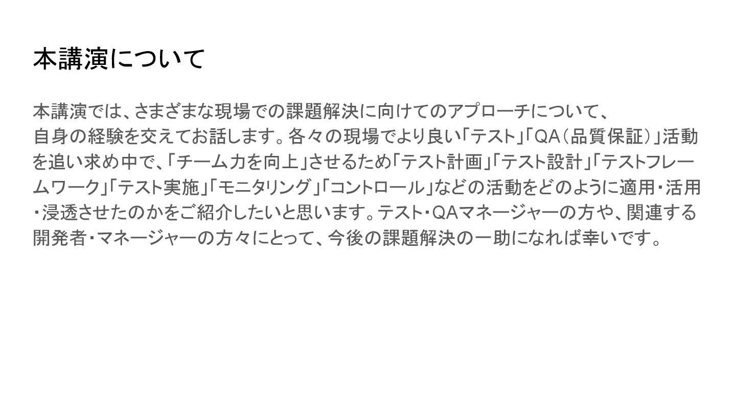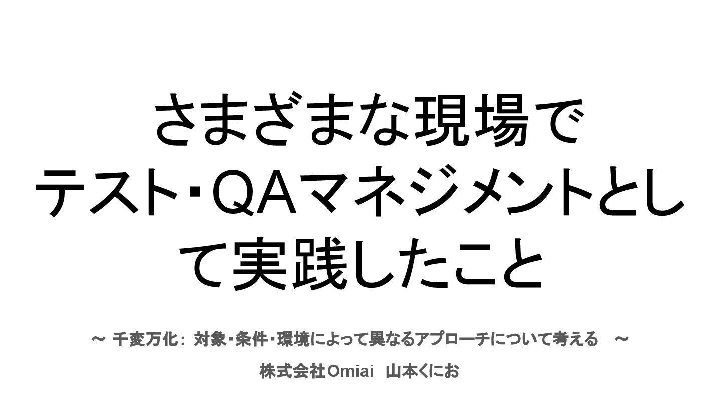 ソフトウェアテスト・QAマネージャーを取り巻く状況は、アジャイル・クラウド・AIなど新技術の進化が激しく、不確実性が高まる一方で、高品質・短納期・高付加価値が求められています。さらに、テスト対象・条件・環境・体制等々によってほとんど同じものがなく「千変万化」している時代です。 そのような状況で、テストマネージャー/QAマネージャーには「テスト」「品質」関連のさまざまな課題を解決することが求められて、その重要性と需要がますます高まっていると思います。 本講演では、さまざまな現場での課題解決に向けてのアプローチについて、自身の経験を交えてお話します。 各々の現場でより良い「テスト」「QA(品質保証)」活動を追い求め中で、「チーム力を向上」させるため「テスト計画」「テスト設計」「テストフレームワーク」「テスト実施」「モニタリング」「コントロール」などの活動をどのように適用・活用・浸透させたのかをご紹介したいと思います。 テスト・QAマネージャーの方や、関連する開発者・マネージャーの方々にとって、今後の課題解決の一助になれば幸いです。
