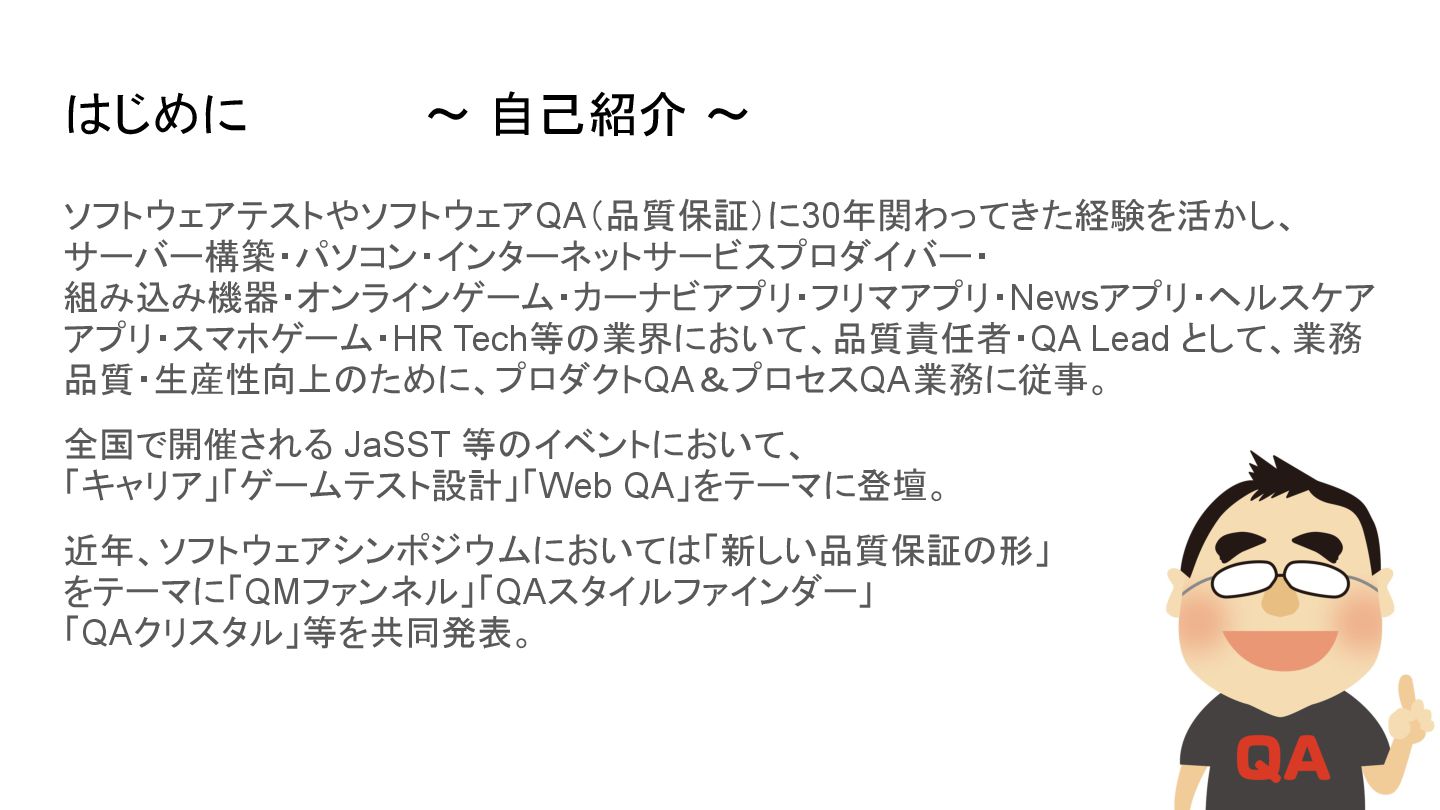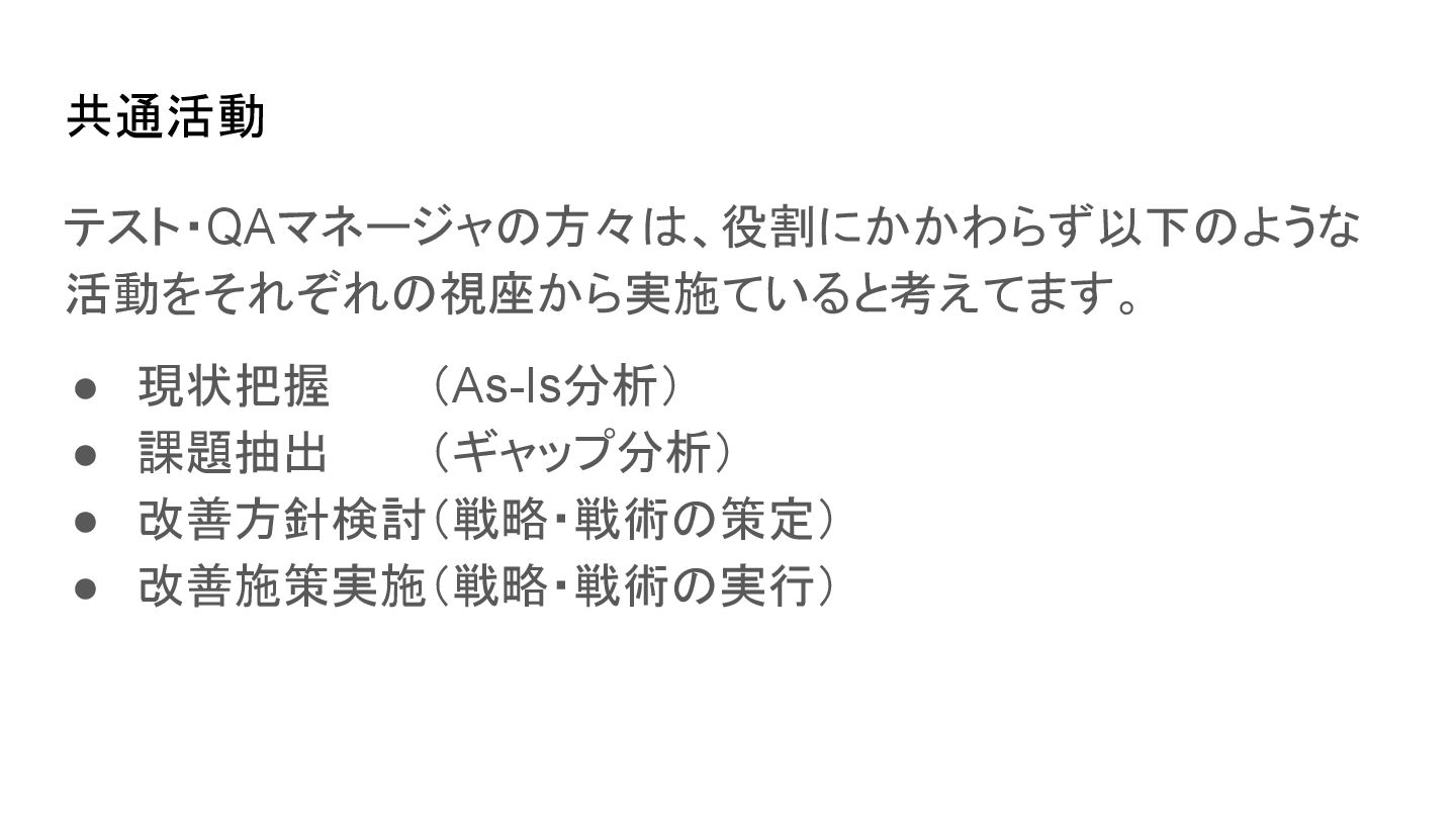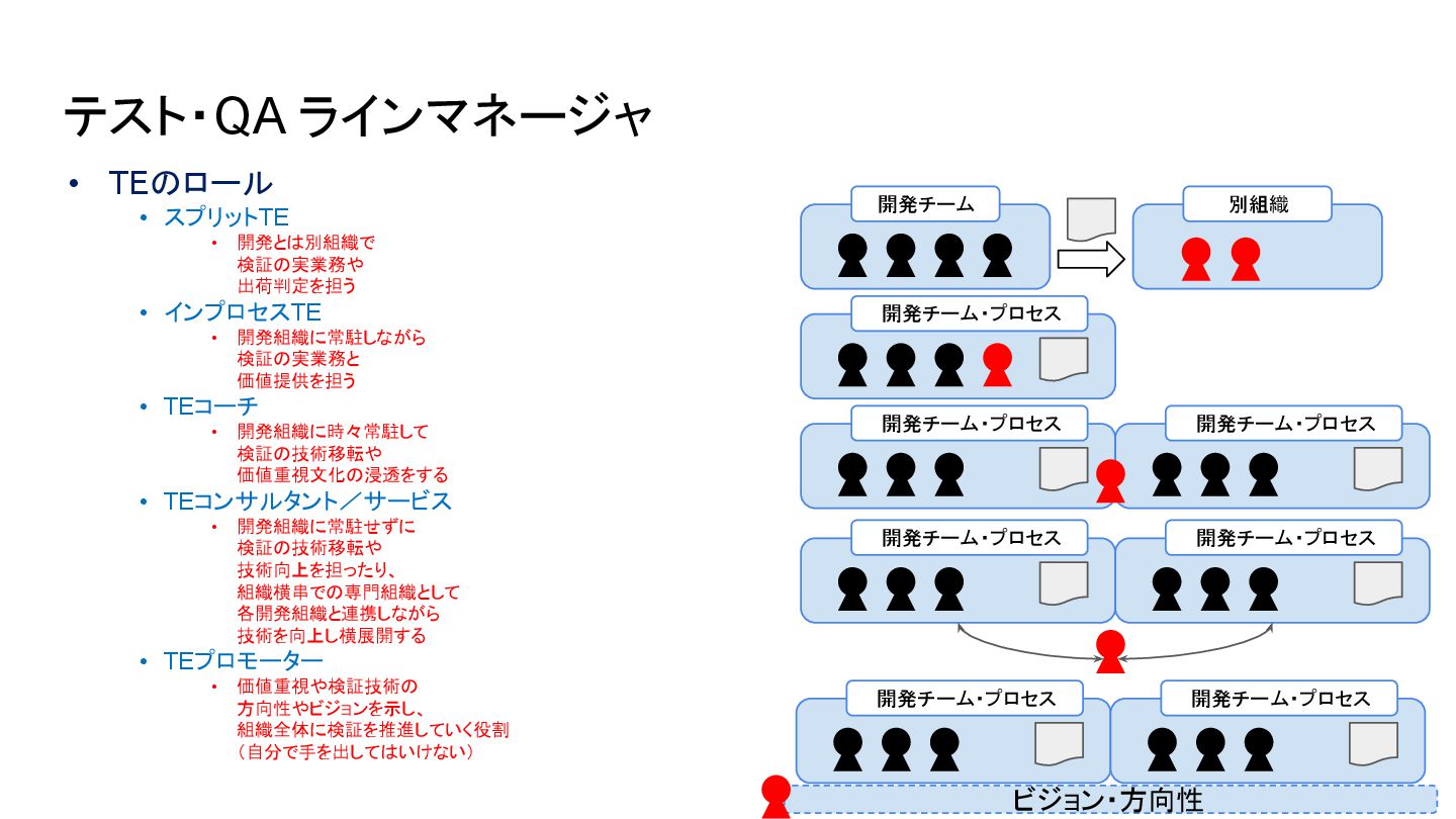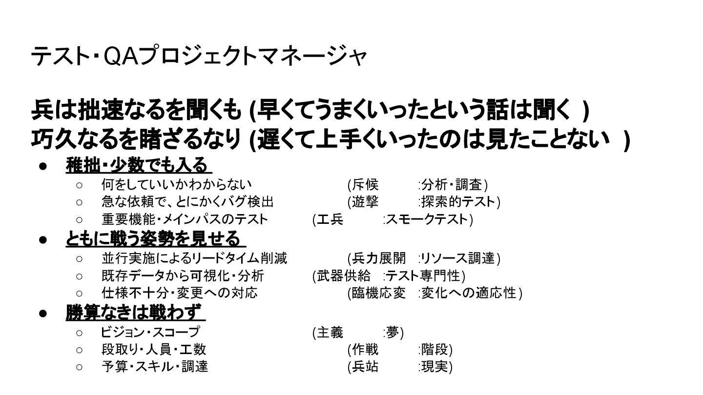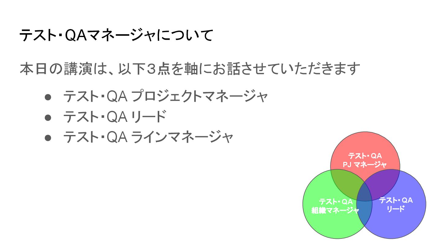 ソフトウェアテスト・QAマネージャーを取り巻く状況は、アジャイル・クラウド・AIなど新技術の進化が激しく、不確実性が高まる一方で、高品質・短納期・高付加価値が求められています。さらに、テスト対象・条件・環境・体制等々によってほとんど同じものがなく「千変万化」している時代です。 そのような状況で、テストマネージャー/QAマネージャーには「テスト」「品質」関連のさまざまな課題を解決することが求められて、その重要性と需要がますます高まっていると思います。 本講演では、さまざまな現場での課題解決に向けてのアプローチについて、自身の経験を交えてお話します。 各々の現場でより良い「テスト」「QA(品質保証)」活動を追い求め中で、「チーム力を向上」させるため「テスト計画」「テスト設計」「テストフレームワーク」「テスト実施」「モニタリング」「コントロール」などの活動をどのように適用・活用・浸透させたのかをご紹介したいと思います。 テスト・QAマネージャーの方や、関連する開発者・マネージャーの方々にとって、今後の課題解決の一助になれば幸いです。