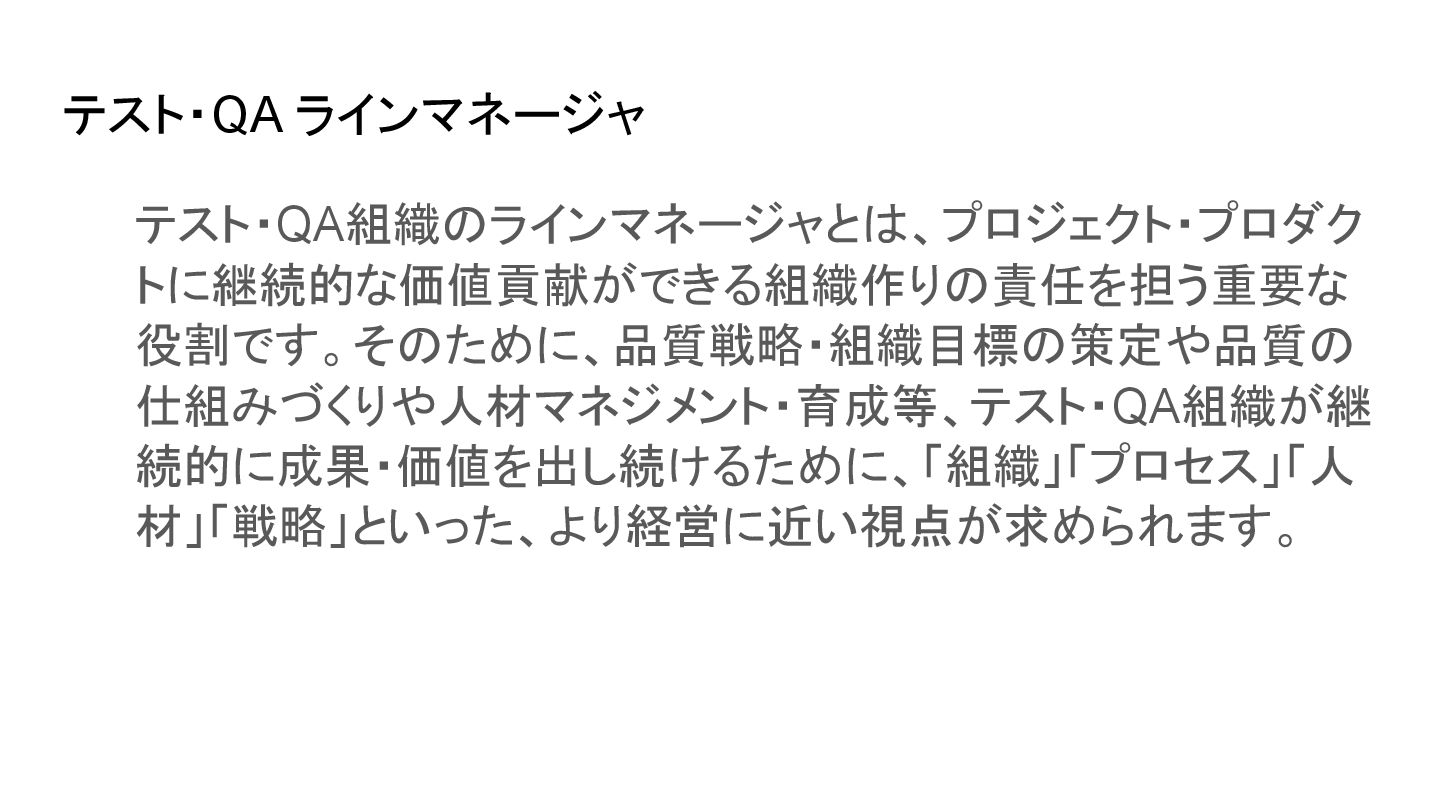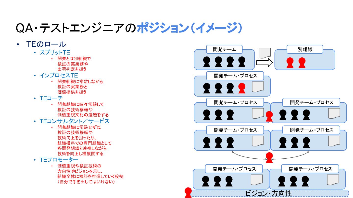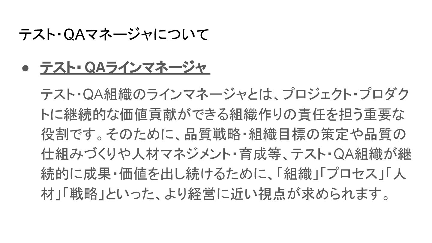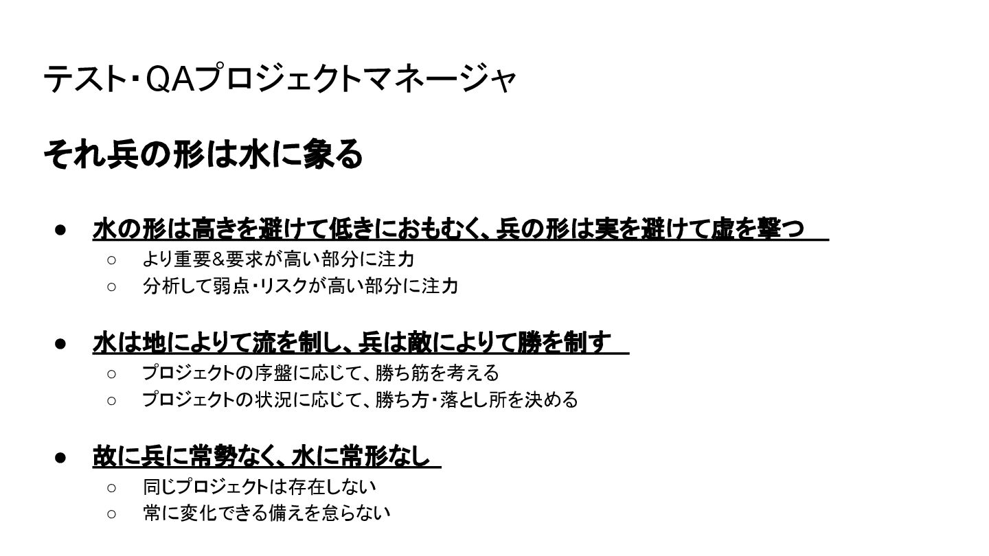ソフトウェアテスト・QAマネージャーを取り巻く状況は、アジャイル・クラウド・AIなど新技術の進化が激しく、不確実性が高まる一方で、高品質・短納期・高付加価値が求められています。さらに、テスト対象・条件・環境・体制等々によってほとんど同じものがなく「千変万化」している時代です。 そのような状況で、テストマネージャー/QAマネージャーには「テスト」「品質」関連のさまざまな課題を解決することが求められて、その重要性と需要がますます高まっていると思います。 本講演では、さまざまな現場での課題解決に向けてのアプローチについて、自身の経験を交えてお話します。 各々の現場でより良い「テスト」「QA(品質保証)」活動を追い求め中で、「チーム力を向上」させるため「テスト計画」「テスト設計」「テストフレームワーク」「テスト実施」「モニタリング」「コントロール」などの活動をどのように適用・活用・浸透させたのかをご紹介したいと思います。 テスト・QAマネージャーの方や、関連する開発者・マネージャーの方々にとって、今後の課題解決の一助になれば幸いです。