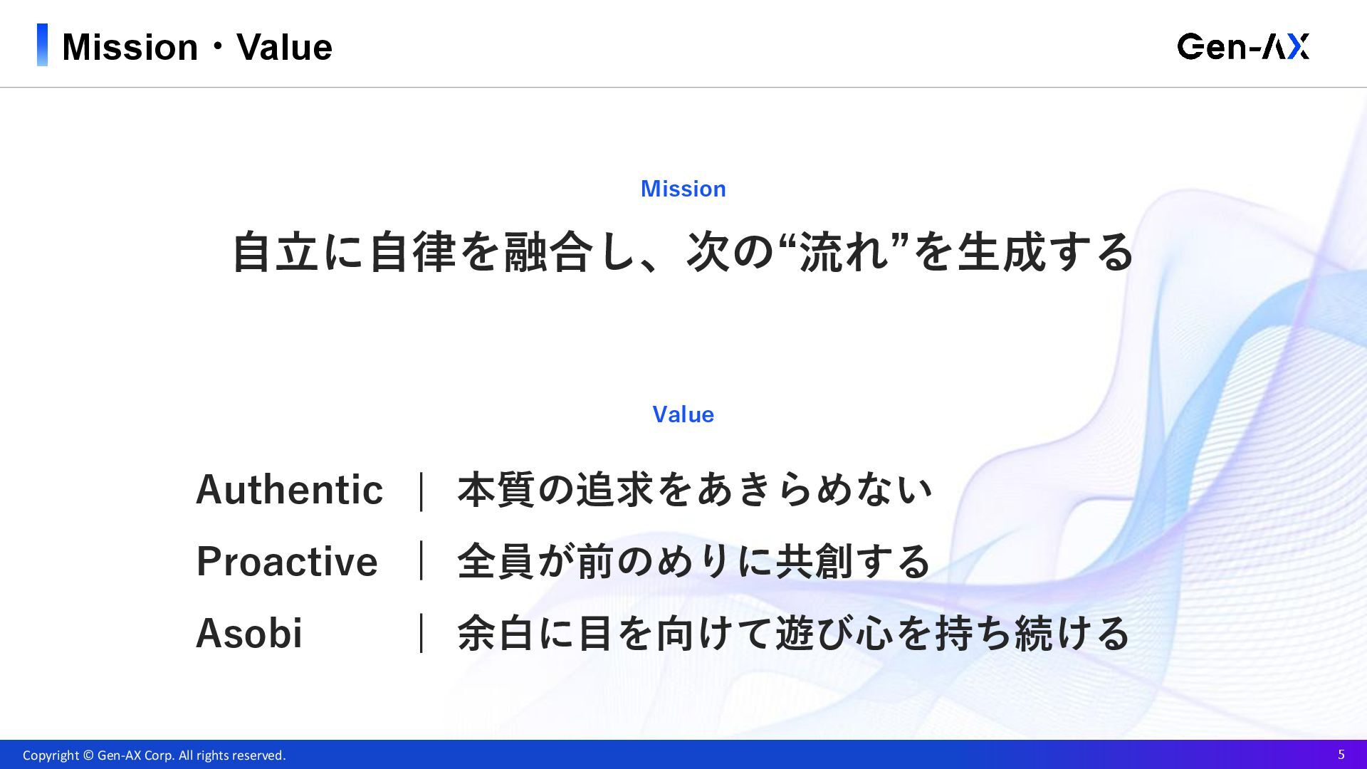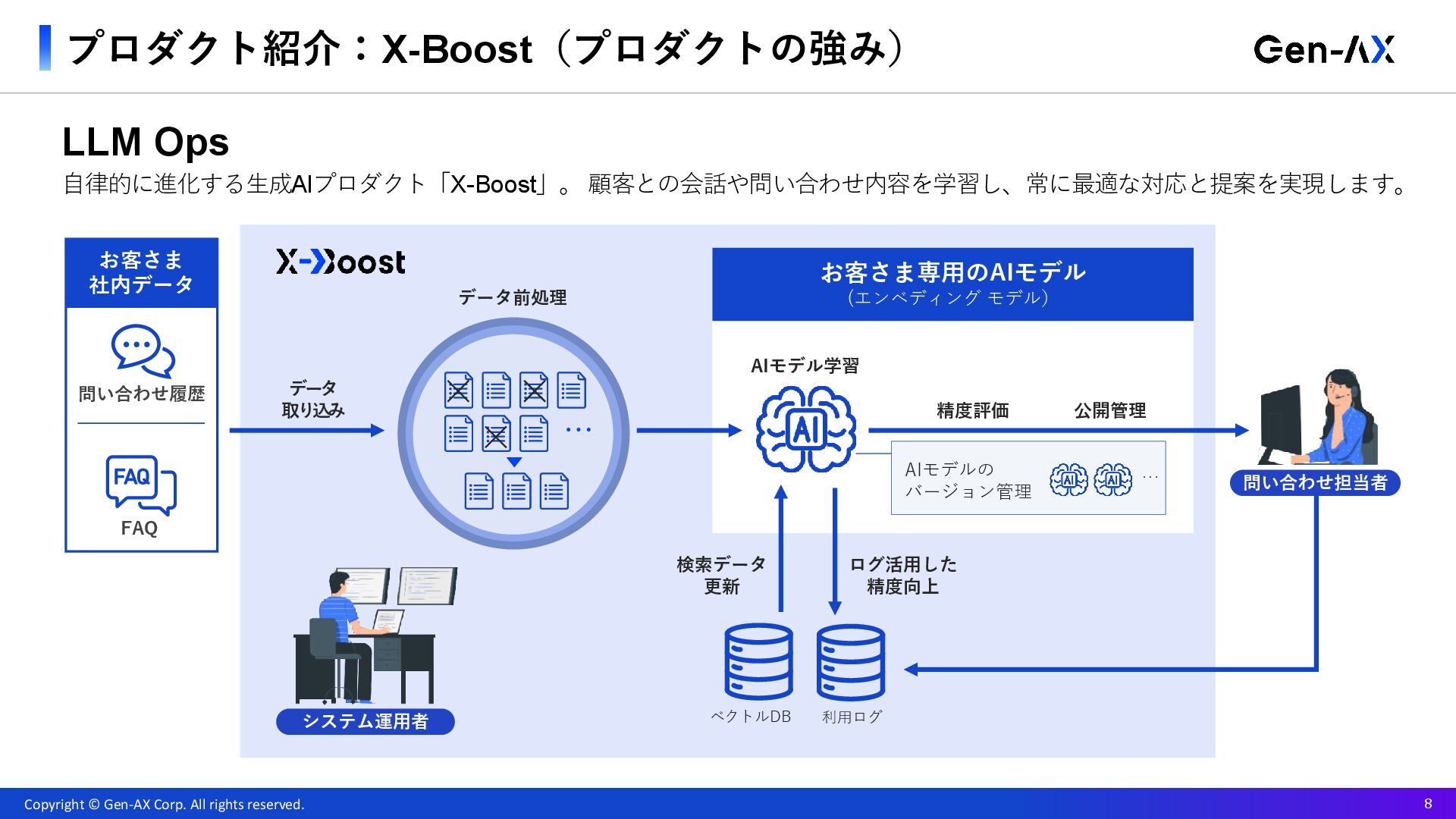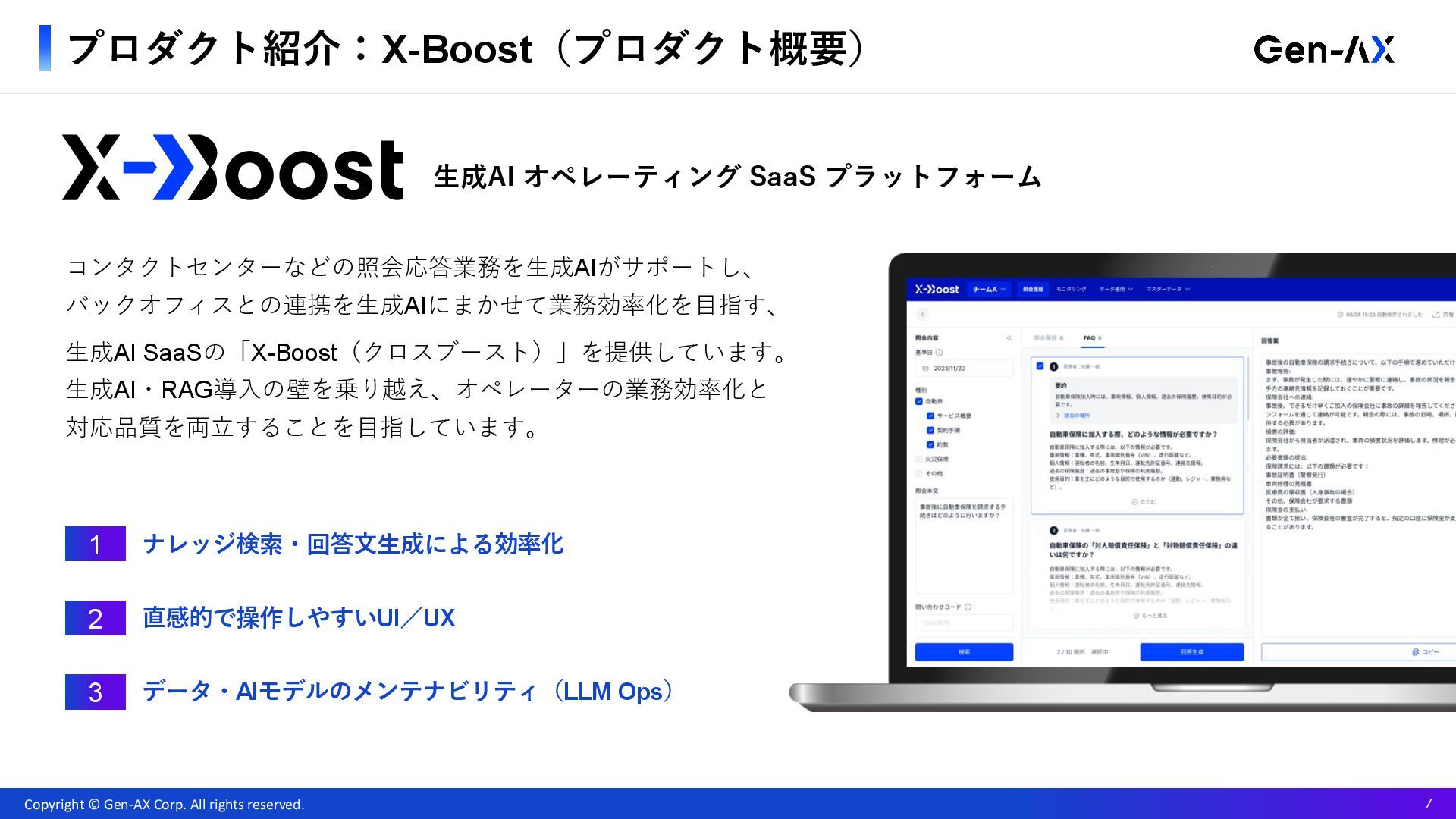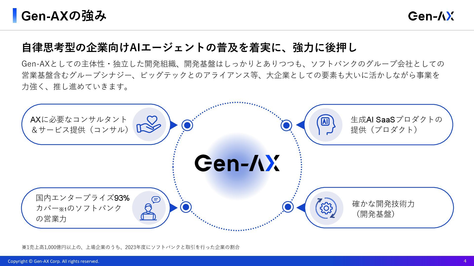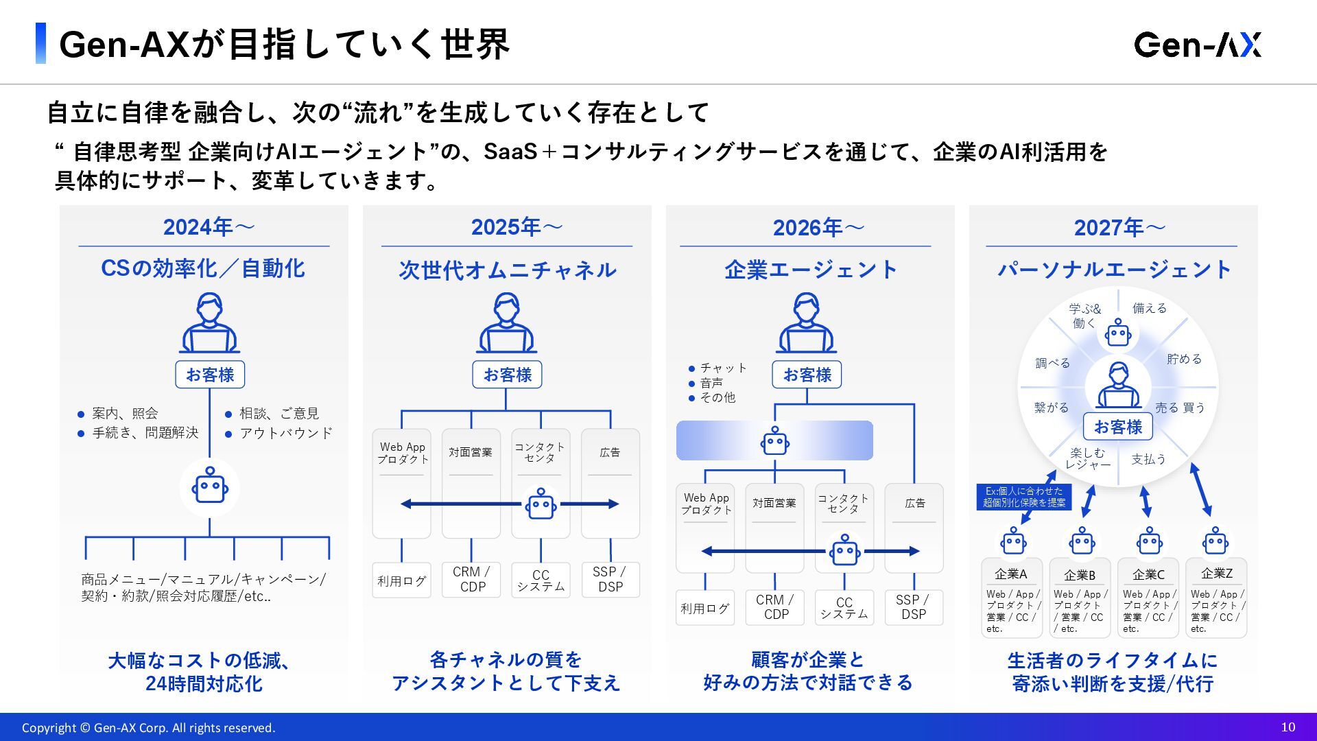 企業向けAIエージェント”の、SaaS+コンサルティングサービスを通じて、企業のAI利活用を 具体的にサポート、変革していきます。 CSの効率化/自動化 2024年〜 次世代オムニチャネル 2025年〜 企業エージェント 2026年〜 パーソナルエージェント 2027年〜 各チャネルの質を アシスタントとして下支え 顧客が企業と 好みの方法で対話できる 生活者のライフタイムに 寄添い判断を支援/代行 ⚫ 相談、ご意見 ⚫ アウトバウンド ⚫ 案内、照会 ⚫ 手続き、問題解決 大幅なコストの低減、 24時間対応化 商品メニュー/マニュアル/キャンペーン/ 契約・約款/照会対応履歴/etc.. Web App プロダクト 対面営業 コンタクト センタ 広告 利用ログ CRM / CDP CC システム SSP / DSP 自立に自律を融合し、次の“流れ”を生成していく存在として 備える 貯める 調べる 売る 買う 繋がる 支払う 楽しむ レジャー 学ぶ& 働く 企業A Web / App / プロダクト / 営業 / CC / etc. 企業B Web / App / プロダクト / 営業 / CC / etc. 企業C Web / App / プロダクト / 営業 / CC / etc. 企業Z Web / App / プロダクト / 営業 / CC / etc. Ex:個人に合わせた 超個別化保険を提案 お客様 お客様 お客様 Web App プロダクト 対面営業 コンタクト センタ 広告 利用ログ CRM / CDP CC システム SSP / DSP ⚫ チャット ⚫ 音声 ⚫ その他 お客様 Gen-AXが目指していく世界