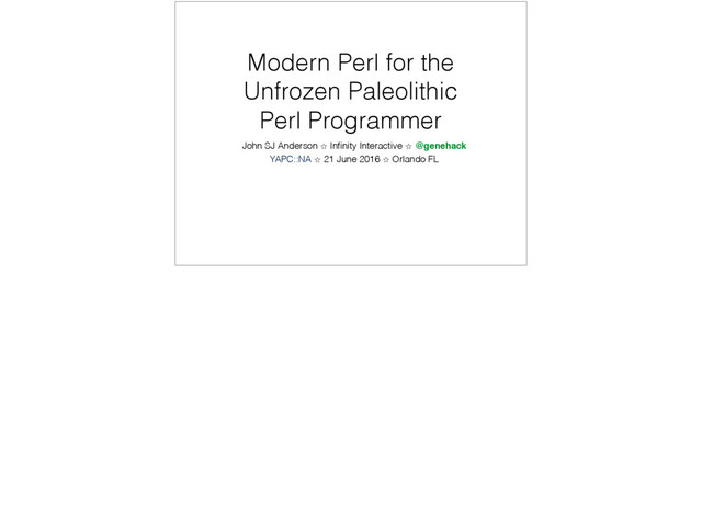 If you last used Perl in the last century, you're probably frightened and confused about all the innovation that's happened in the Perl community when you weren't paying attention. If you come to this talk, you’ll learn the best practices around issues such as which version of Perl5 to use, Perl5 installation management, language features/libraries to use and avoid, modern tooling, and more!
