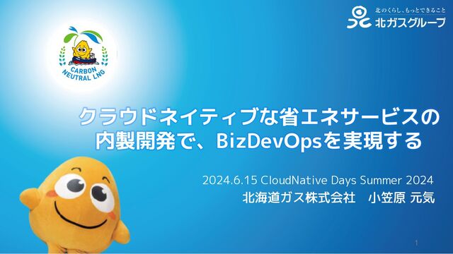 北海道ガス株式会社 小笠原 元気 クラウドネイティブな省エネサービスの 内製開発で、BizDevOpsを実現する 1 2024.6.15 CloudNative Days Summer