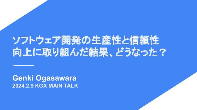 ソフトウェア開発の生産性と信頼性 向上に取り組んだ結果、どうなった? Genki Ogasawara 2024.2.9 KGX MAIN TALK
