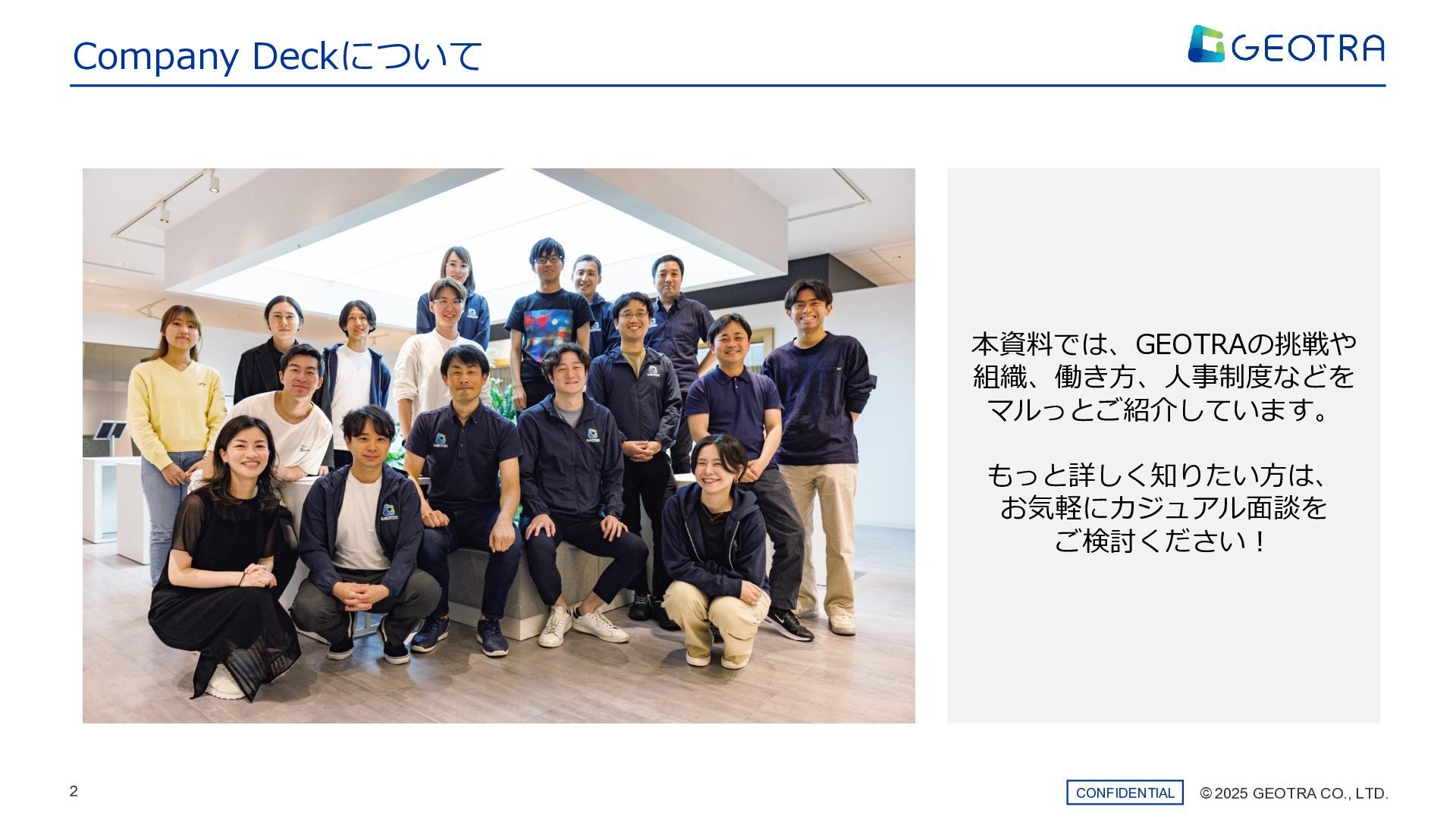 ©︎ 2025 GEOTRA CO., LTD. 2 CONFIDENTIAL Company Deckについて 本資料では、GEOTRAの挑戦や