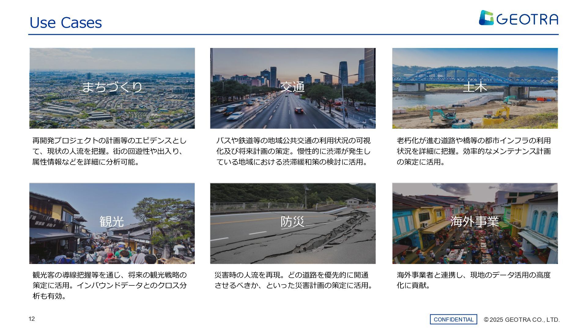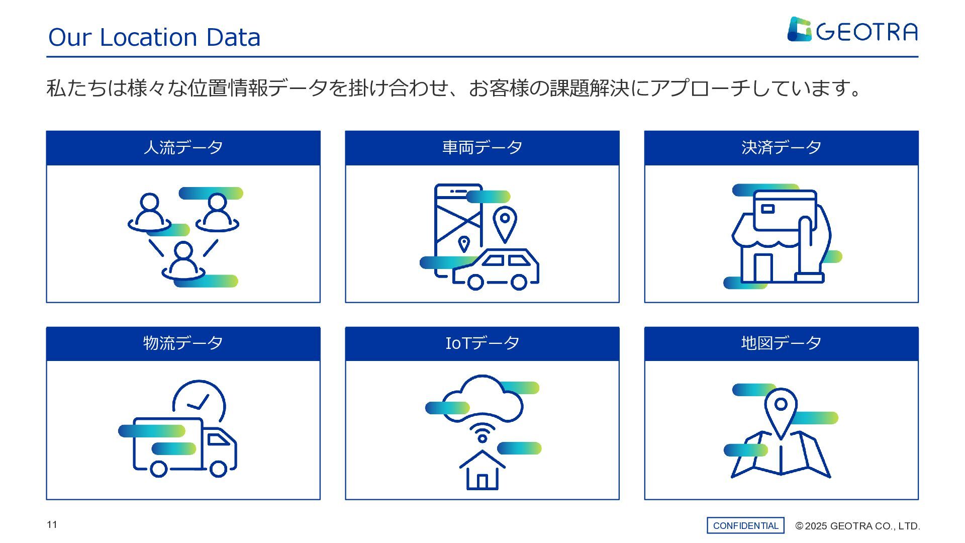 ©︎ 2025 GEOTRA CO., LTD. 11 CONFIDENTIAL 私たちは様々な位置情報データを掛け合わせ、お客様の課題解決にアプローチしています。 Our Location