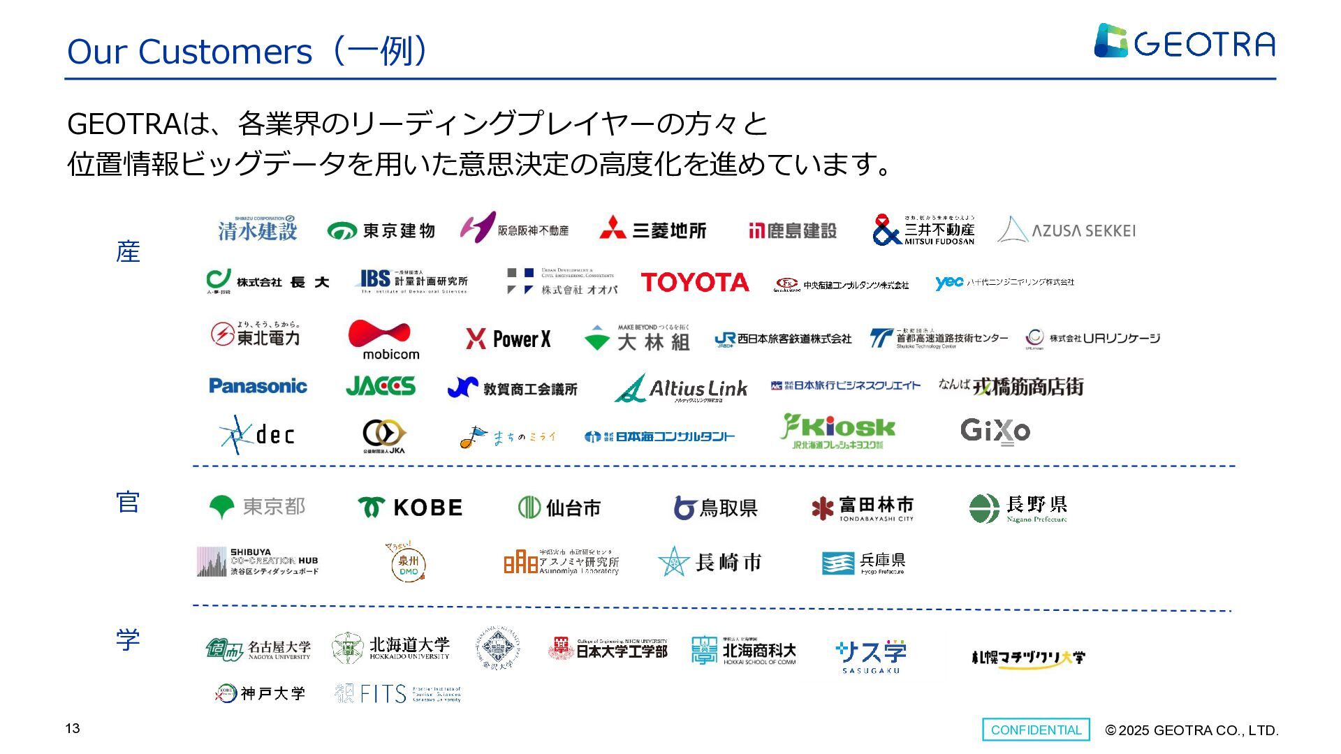 ©︎ 2025 GEOTRA CO., LTD. CONFIDENTIAL 13 Our Customers(一例) GEOTRAは、各業界のリーディングプレイヤーの方々と