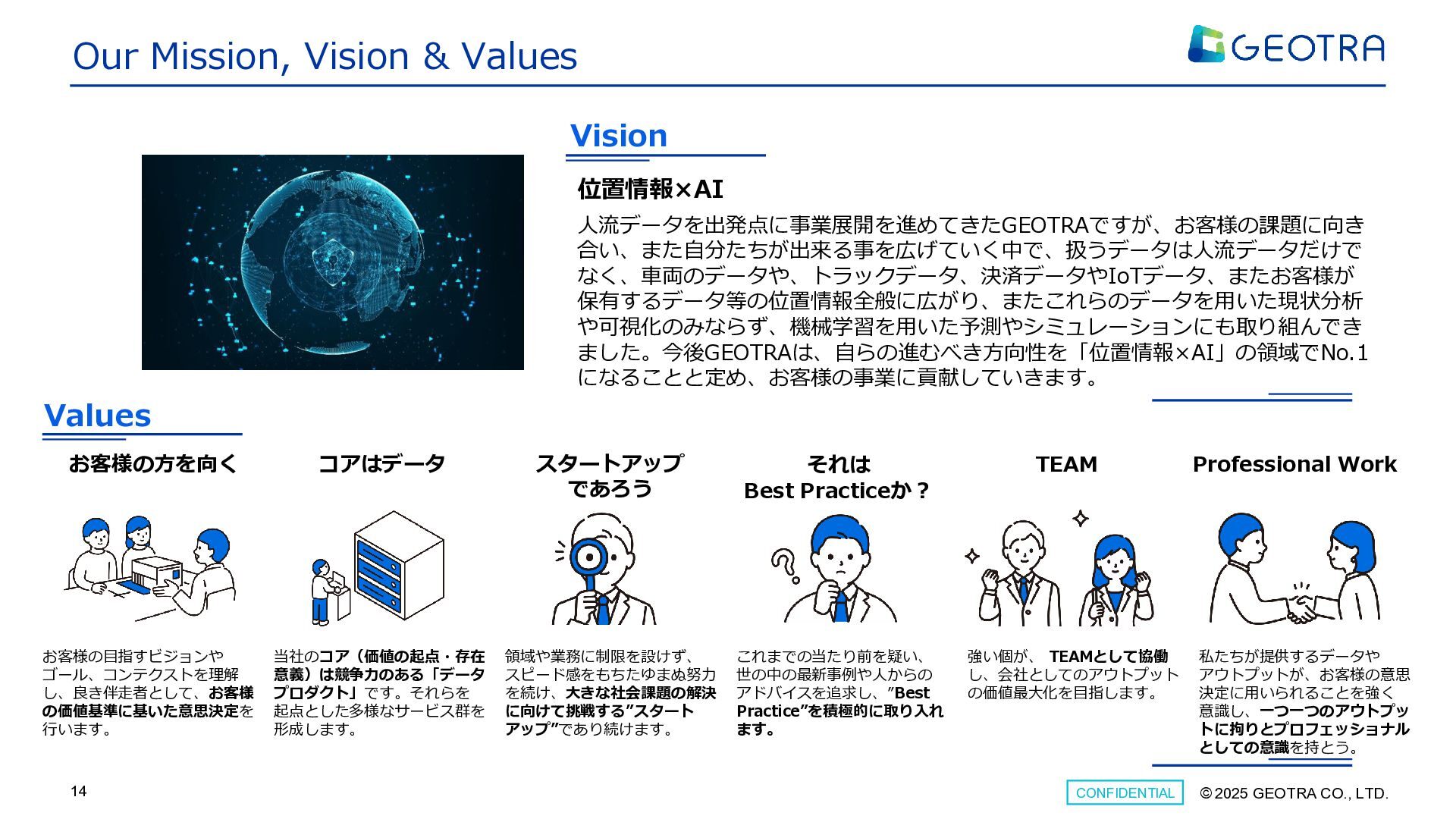 & Values 人流データを出発点に事業展開を進めてきたGEOTRAですが、お客様の課題に向き 合い、また自分たちが出来る事を広げていく中で、扱うデータは人流データだけで なく、車両のデータや、トラックデータ、決済データやIoTデータ、またお客様が 保有するデータ等の位置情報全般に広がり、またこれらのデータを用いた現状分析 や可視化のみならず、機械学習を用いた予測やシミュレーションにも取り組んでき ました。今後GEOTRAは、自らの進むべき方向性を「位置情報×AI」の領域でNo.1 になることと定め、お客様の事業に貢献していきます。 Vision 位置情報×AI Values お客様の方を向く お客様の目指すビジョンや ゴール、コンテクストを理解 し、良き伴走者として、お客様 の価値基準に基いた意思決定を 行います。 それは Best Practiceか? これまでの当たり前を疑い、 世の中の最新事例や人からの アドバイスを追求し、”Best Practice”を積極的に取り入れ ます。 スタートアップ であろう 領域や業務に制限を設けず、 スピード感をもちたゆまぬ努力 を続け、大きな社会課題の解決 に向けて挑戦する”スタート アップ”であり続けます。 コアはデータ 当社のコア(価値の起点・存在 意義)は競争力のある「データ プロダクト」です。それらを 起点とした多様なサービス群を 形成します。 TEAM 強い個が、 TEAMとして協働 し、会社としてのアウトプット の価値最大化を目指します。 私たちが提供するデータや アウトプットが、お客様の意思 決定に用いられることを強く 意識し、一つ一つのアウトプッ トに拘りとプロフェッショナル としての意識を持とう。 Professional Work