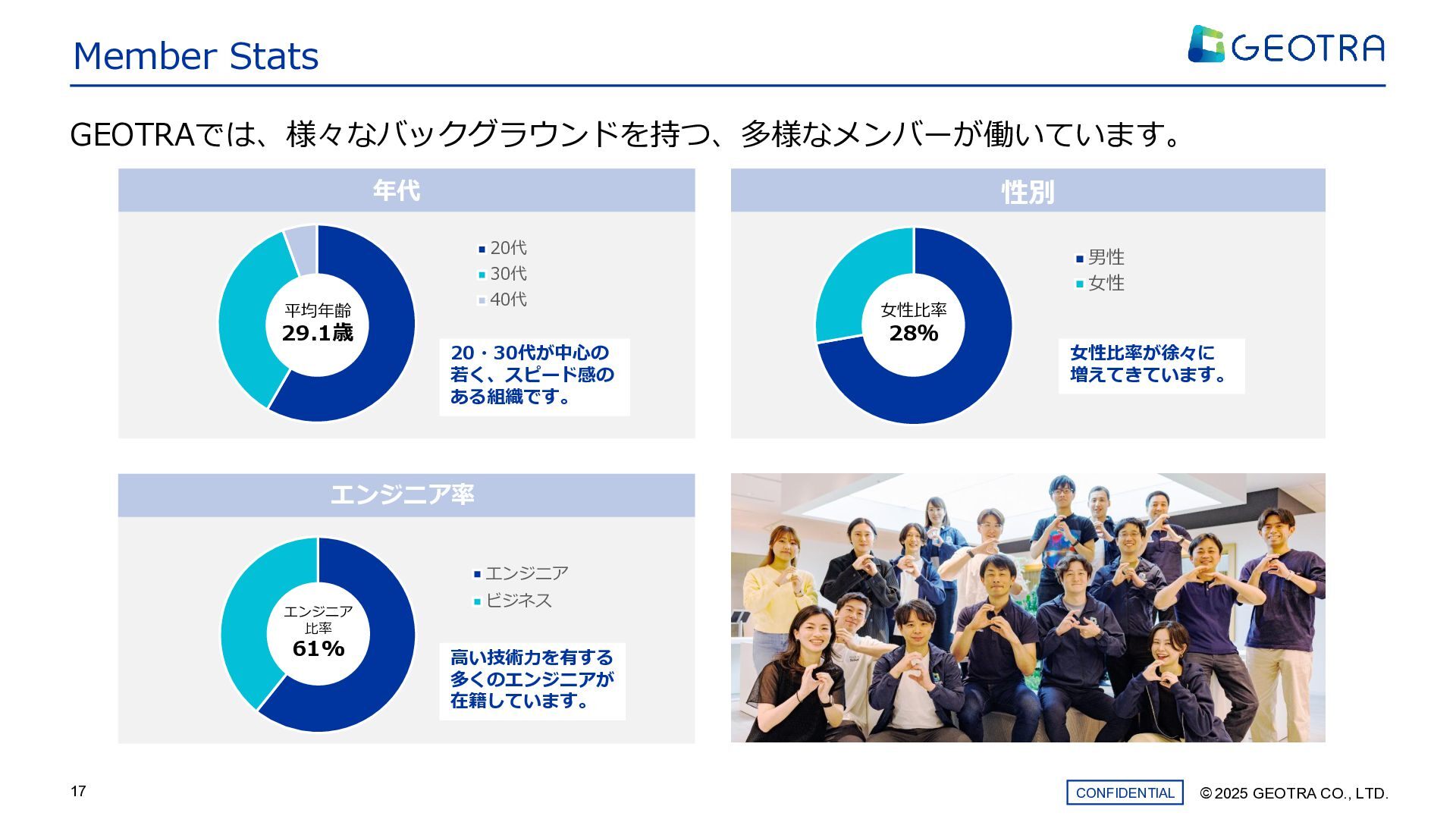 ©︎ 2025 GEOTRA CO., LTD. CONFIDENTIAL 17 Member Stats GEOTRAでは、様々なバックグラウンドを持つ、多様なメンバーが働いています。