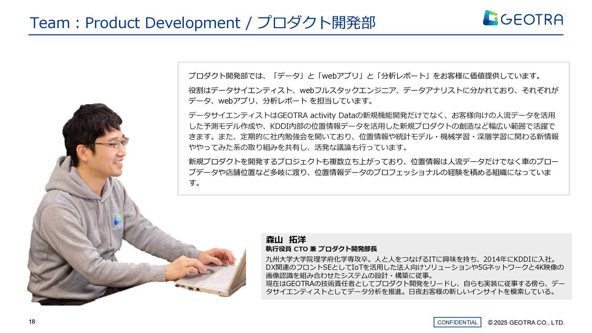 プロダクト開発部 森山 拓洋 執行役員 CTO 兼 プロダクト開発部長 九州大学大学院理学府化学専攻卒。人と人をつなげるITに興味を持ち、2014年にKDDIに入社。 DX関連のフロントSEとしてIoTを活用した法人向けソリューションや5Gネットワークと4K映像の 画像認識を組み合わせたシステムの設計・構築に従事。 現在はGEOTRAの技術責任者としてプロダクト開発をリードし、自らも実装に従事する傍ら、デー タサイエンティストとしてデータ分析を推進。日夜お客様の新しいインサイトを模索している。 プロダクト開発部では、「データ」と「webアプリ」と「分析レポート」をお客様に価値提供しています。 役割はデータサイエンティスト、webフルスタックエンジニア、データアナリストに分かれており、それぞれが データ、webアプリ、分析レポート を担当しています。 データサイエンティストはGEOTRA activity Dataの新規機能開発だけでなく、お客様向けの人流データを活用 した予測モデル作成や、KDDI内部の位置情報データを活用した新規プロダクトの創造など幅広い範囲で活躍で きます。また、定期的に社内勉強会を開いており、位置情報や統計モデル・機械学習・深層学習に関わる新情報 ややってみた系の取り組みを共有し、活発な議論も行っています。 新規プロダクトを開発するプロジェクトも複数立ち上がっており、位置情報は人流データだけでなく車のプロー ブデータや店舗位置など多岐に渡り、位置情報データのプロフェッショナルの経験を積める組織になっていま す。