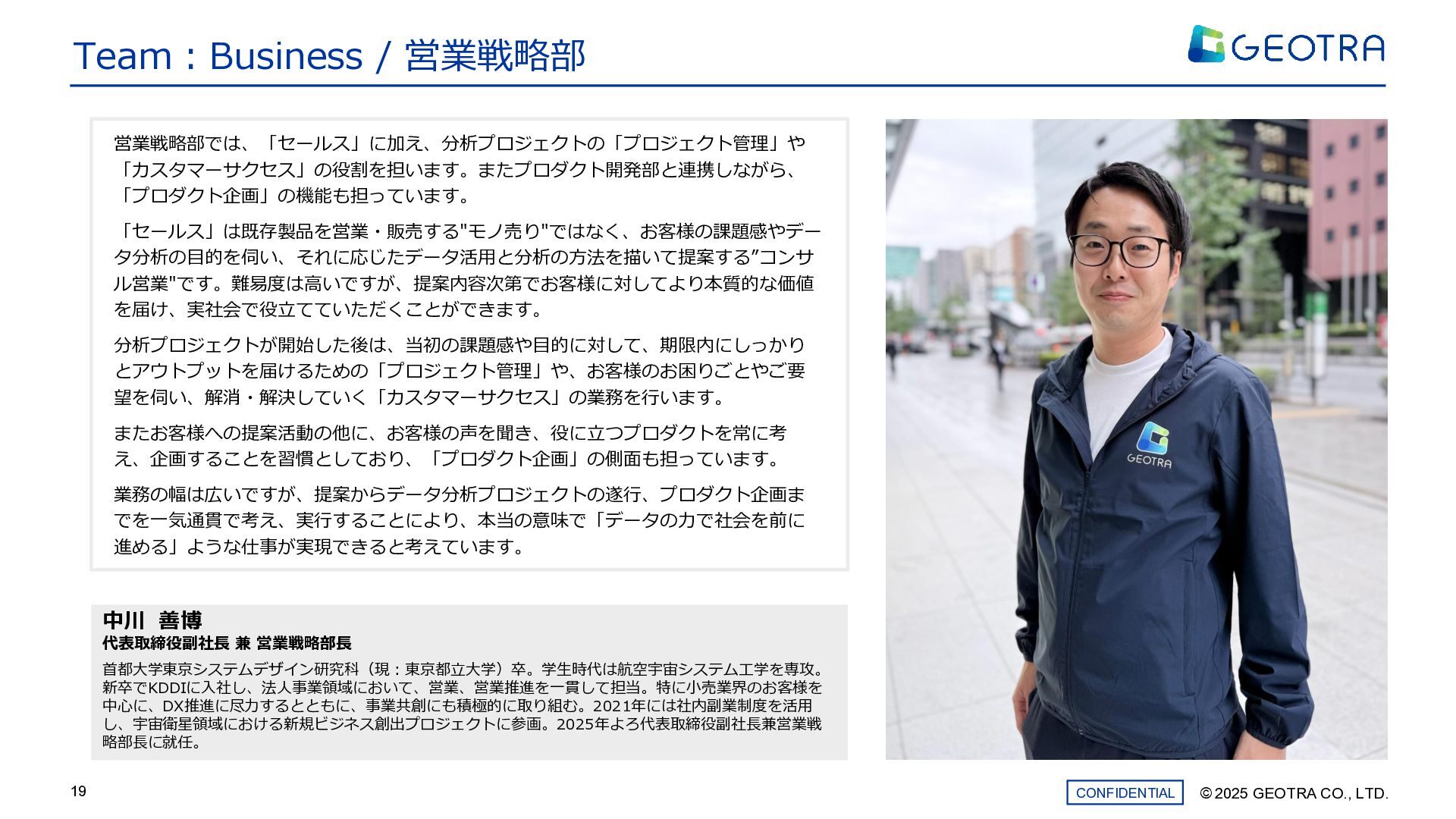 ©︎ 2025 GEOTRA CO., LTD. CONFIDENTIAL 19 Team:Business / 営業戦略部