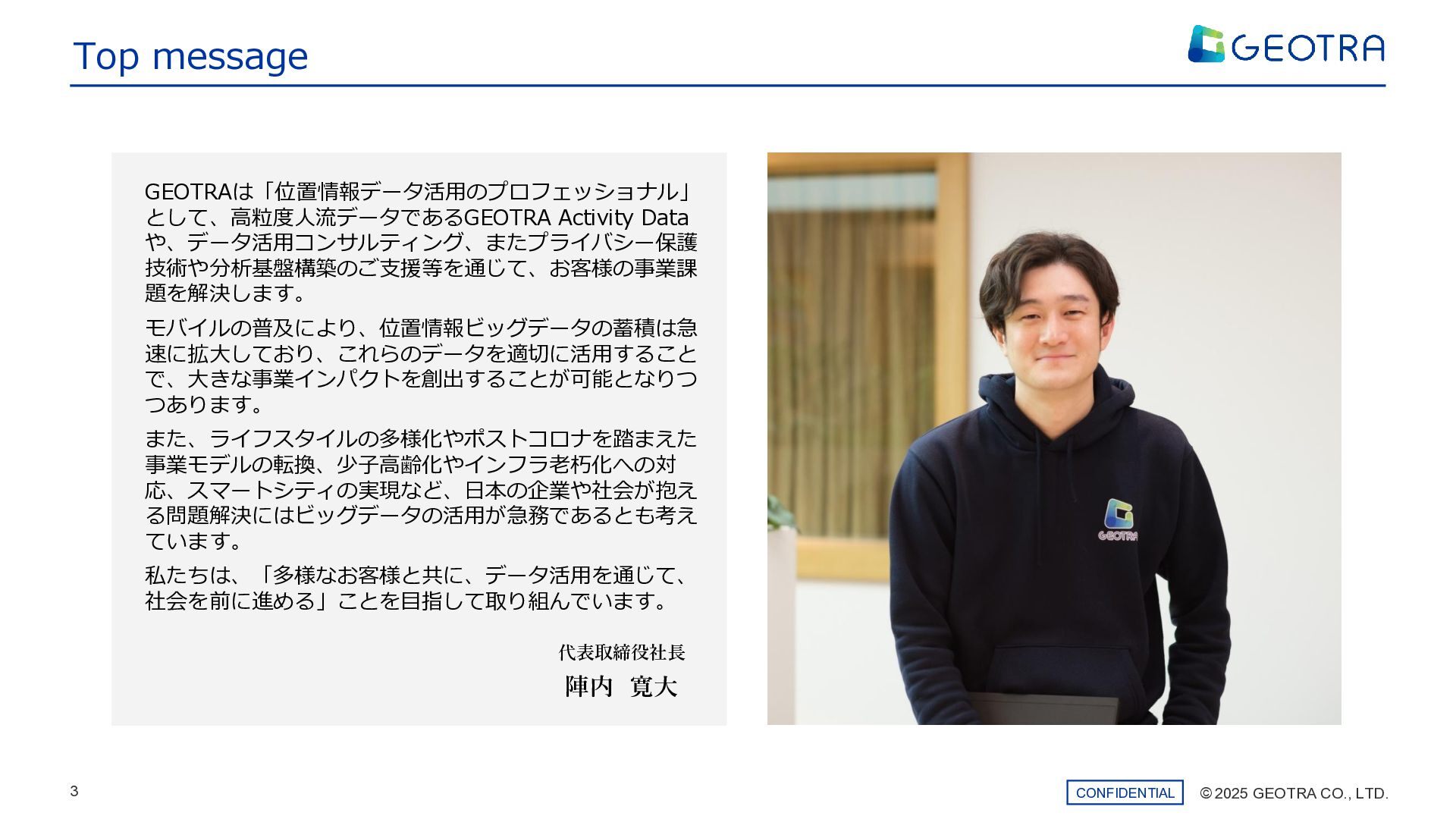 ©︎ 2025 GEOTRA CO., LTD. 3 CONFIDENTIAL 代表取締役社長 陣内 寛大