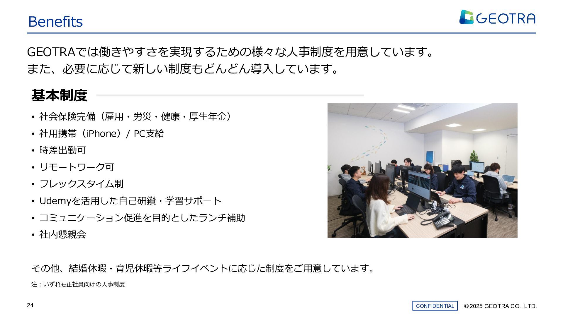 ©︎ 2025 GEOTRA CO., LTD. CONFIDENTIAL 24 Benefits GEOTRAでは働きやすさを実現するための様々な人事制度を用意しています。 また、必要に応じて新しい制度もどんどん導入しています。