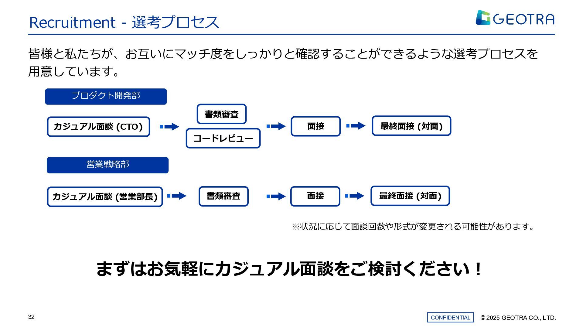 ©︎ 2025 GEOTRA CO., LTD. CONFIDENTIAL 32 Recruitment - 選考プロセス