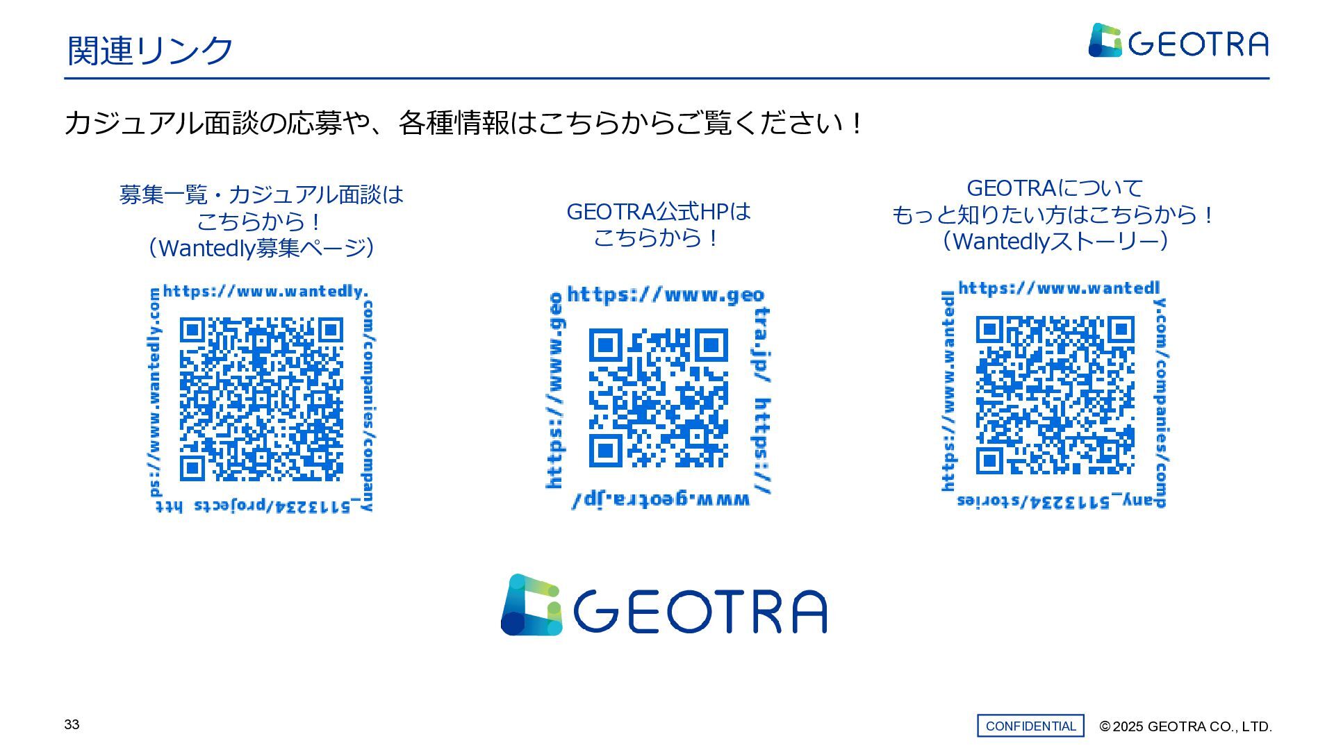 ©︎ 2025 GEOTRA CO., LTD. CONFIDENTIAL 33 関連リンク カジュアル面談の応募や、各種情報はこちらからご覧ください! 募集一覧・カジュアル面談は