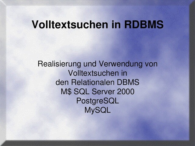 dafür tsearch2 • neuer Datentyp tsvector • Unterstützung für Stemming • Verwendet GiST-Index • implizite Aktualisierung des FTI • Generierung zu jedem Zeitpunkt möglich
