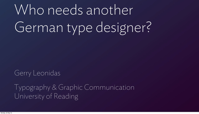 This is one of the first questions Gerry asks aspiring typeface designers, and is usually met with the sound of jaws hitting the floor. Yet typeface design is the most obvious area where design is losing any regional identity it had (such as it was). In the process, it confronts us with questions about typography, and our roles in design. It also makes things really exciting.