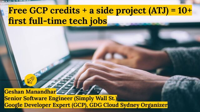 In this talk, you will learn about a community that helped 10+ people land their first full-time tech jobs in 3 years using a side project as leverage. The tale started when Geshan Manandhar became a Google Developer Export (GDE) for Google Cloud Platform (GCP) at the end of 2019. Geshan used the first batch of free Google Cloud Platform (GCP) - $500 to start a side project called AU Tech Jobs. The free credit was used to host the project on GCP using Google Cloud Run, Google Cloud Build, and other services like Cloud logging and cloud trace.