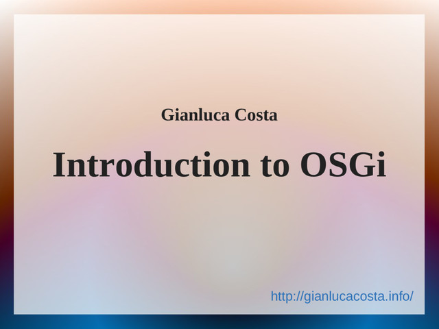 and modularity lies at its very heart • In this presentation, we'll briefly introduce the fundamentals of OSGi - a dynamic module system for the Java Virtual Machine • The author would like to thank: – Professor Paolo Bellavista, for his kind and valuable advice and suggestions – Neil Bartlett, author of the beautiful, free, Creative Commons-licensed book OSGi in practice