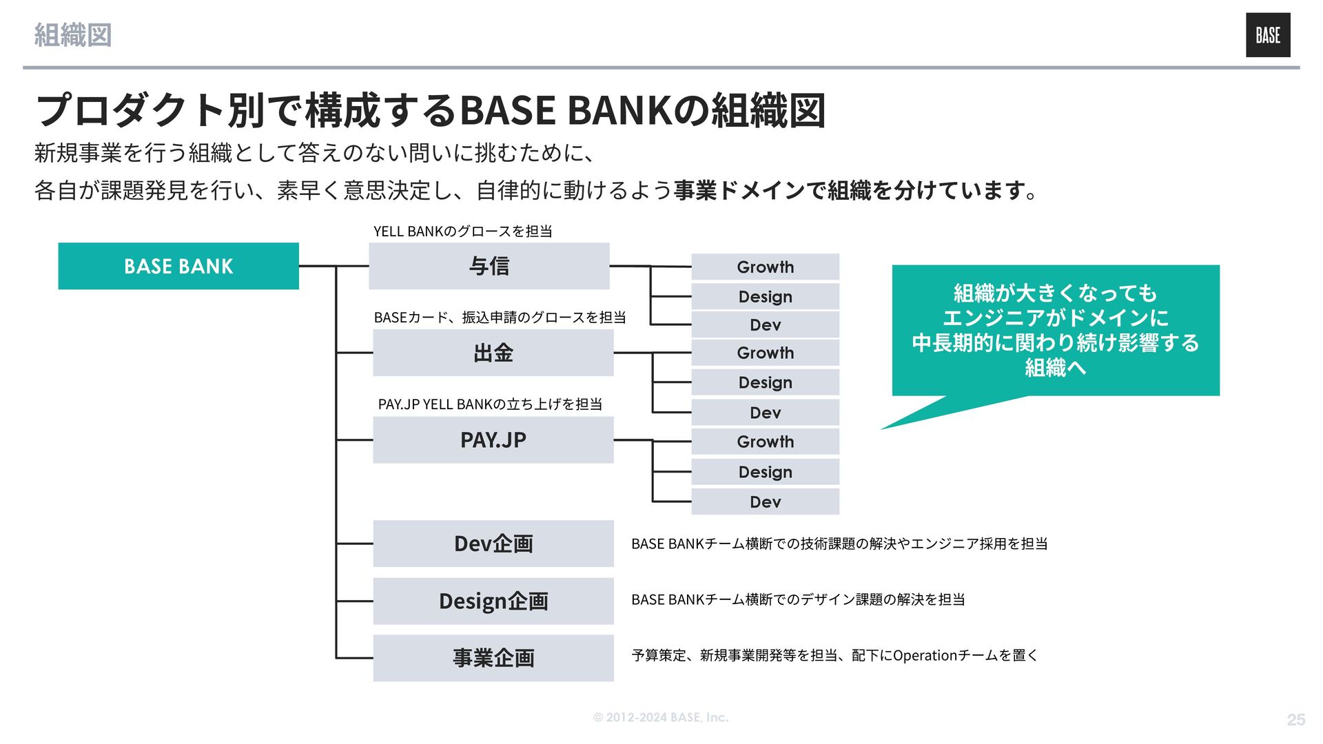 BASE BANK Growth Design Dev 与信 Design企画 出⾦ 事業企画 Growth Design Dev PAY.JP Dev企画 Growth Design Dev BASE BANKチーム横断での技術課題の解決やエンジニア採⽤を担当 BASE BANKチーム横断でのデザイン課題の解決を担当 予算策定、新規事業開発等を担当、配下にOperationチームを置く 組織が⼤きくなっても エンジニアがドメインに 中⻑期的に関わり続け影響する 組織へ YELL BANKのグロースを担当 BASEカード、振込申請のグロースを担当 PAY.JP YELL BANKの⽴ち上げを担当