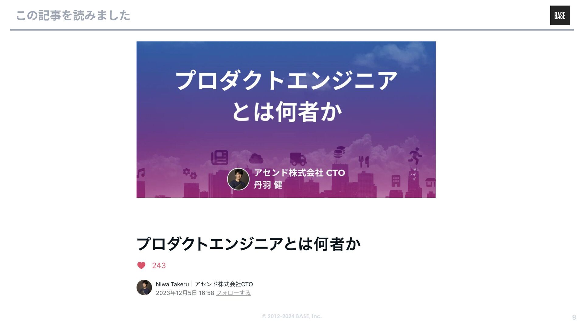 7. © 2012-2024 BASE, Inc. 20 遡りながら役割を広げていくのは個⼈的にはやりやすかった まとめ コアユーザーを 決める 事業計画を作る