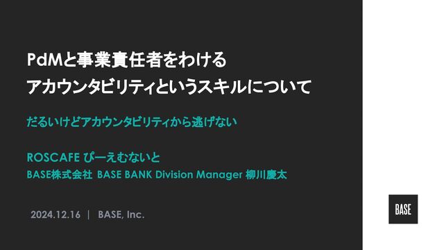 PdMと事業責任者をわける アカウンタビリティというスキルについて だるいけどアカウンタビリティから逃げない ROSCAFE ぴーえむないと BASE株式会社 BASE BANK Division Manager 柳川慶太 2024.12.16