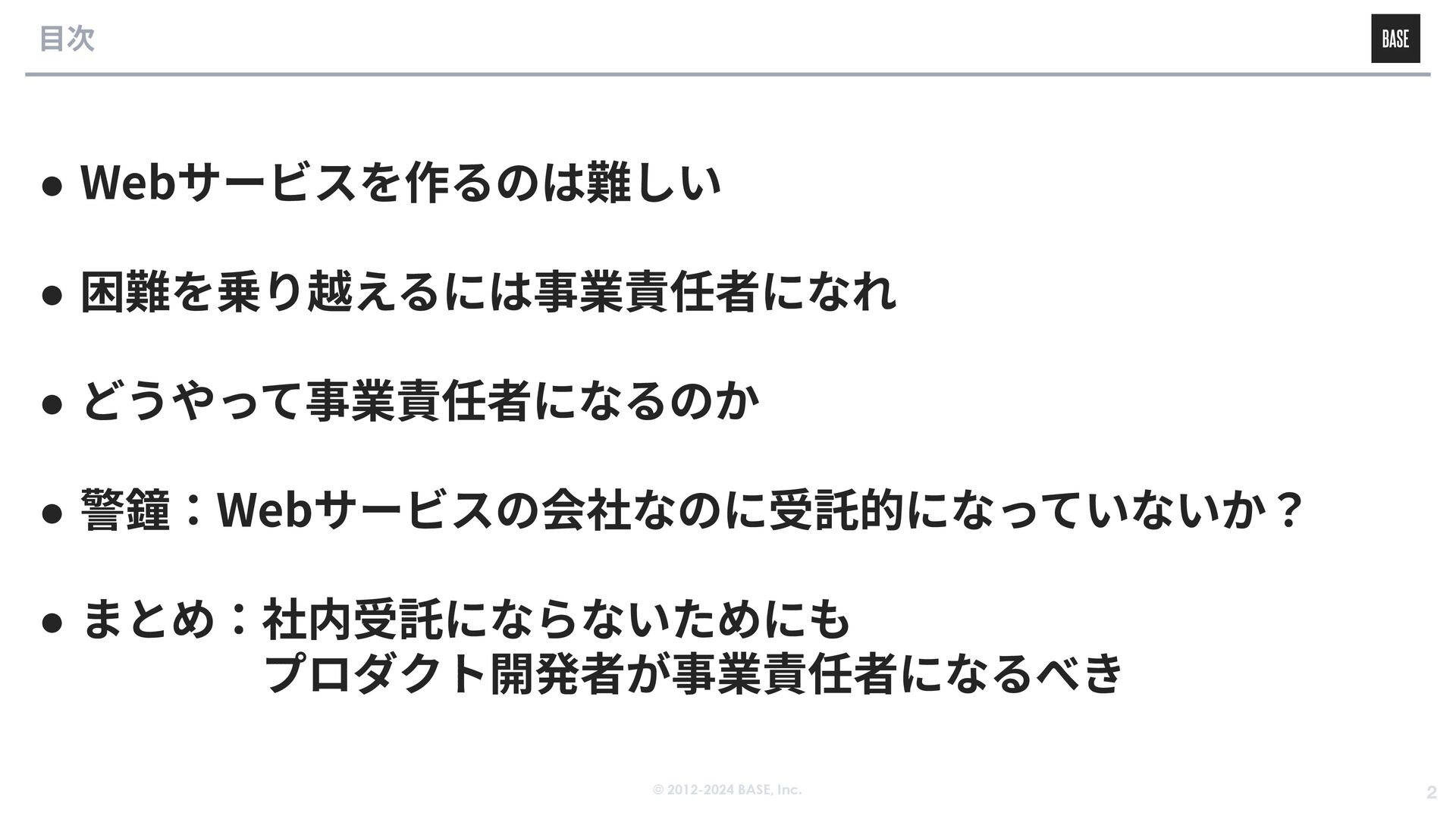 © 2012-2024 BASE, Inc. 59 ⽬次 • Webサービスを作るのは難しい • 困難を乗り越えるには事業責任者になれ