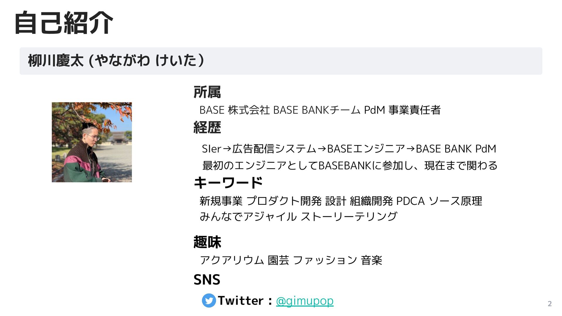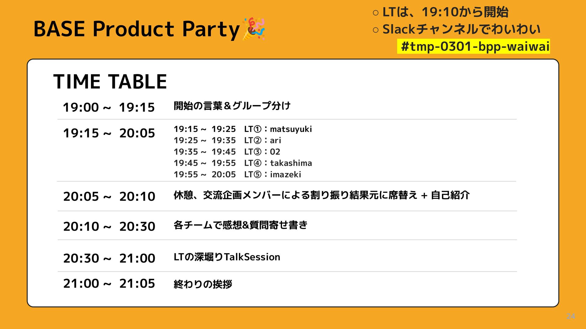 19:15 ~ 19:25 LT①:matsuyuki 19:25 ~ 19:35 LT②:ari 19:35 ~ 19:45 LT③:02 19:45 ~ 19:55 LT④:takashima 19:55 ~ 20:05 LT⑤:imazeki 20:05 ~ 20:10 休憩、交流企画メンバーによる割り振り結果元に席替え + 自己紹介 20:10 ~ 20:30 各チームで感想&質問寄せ書き 20:30 ~ 21:00 LTの深堀りTalkSession 終わりの挨拶 21:00 ~ 21:05 BASE Product Party🎉 ◦ LTは、19:10から開始 ◦ Slackチャンネルでわいわい #tmp-0301-bpp-waiwai