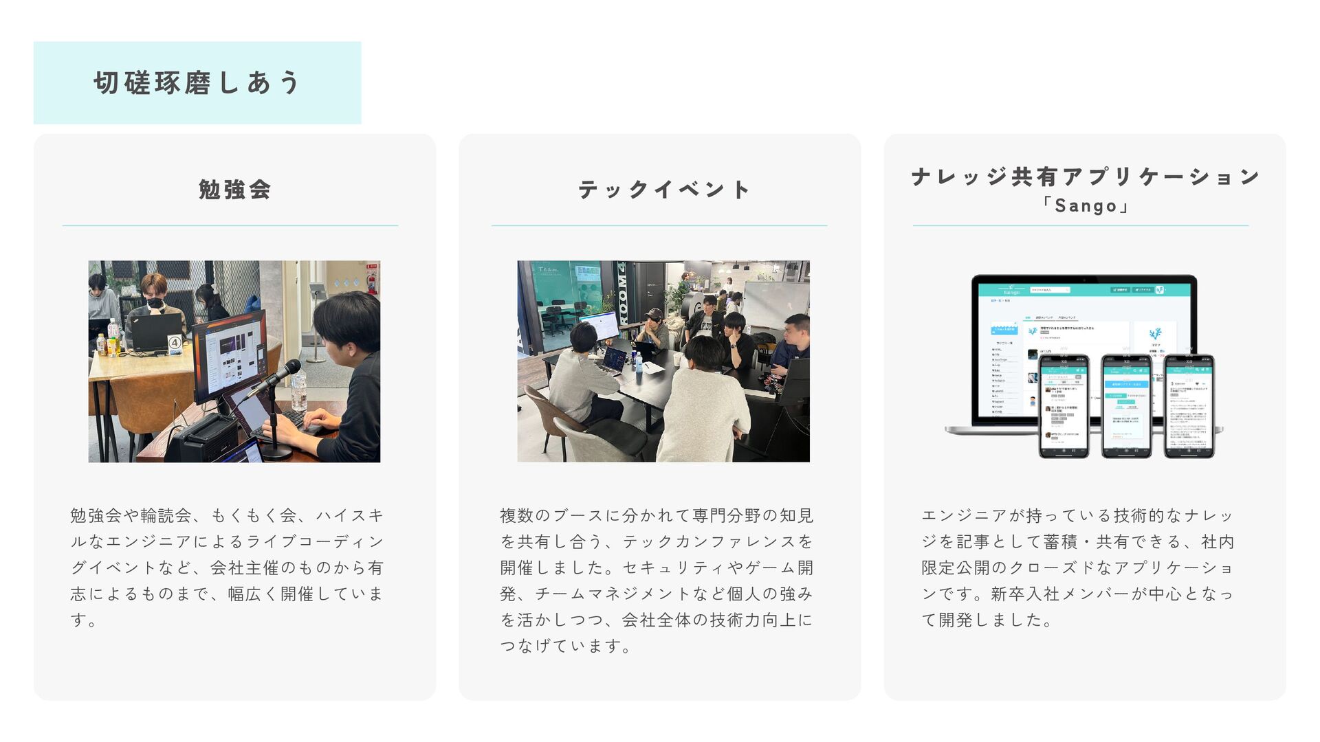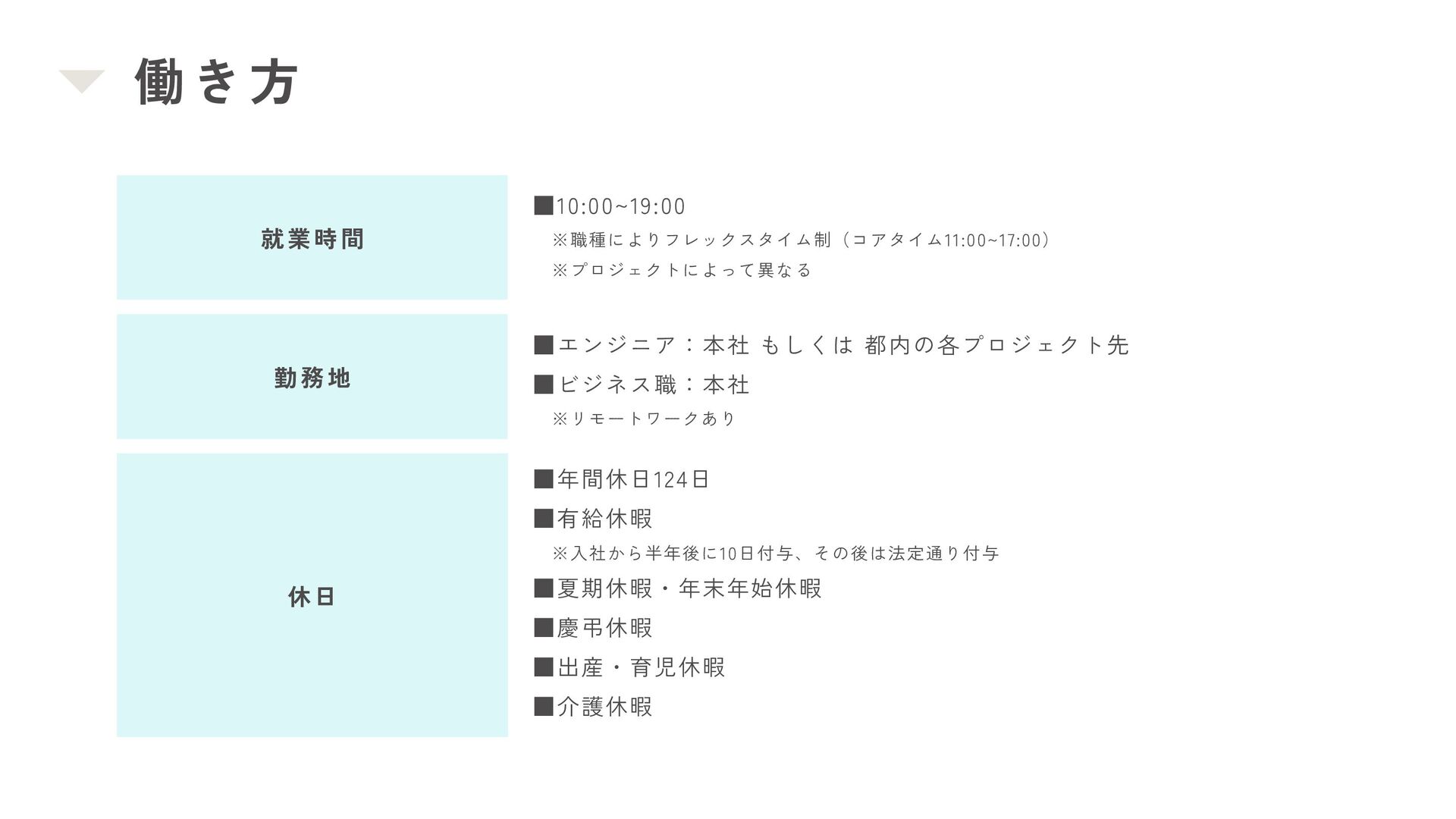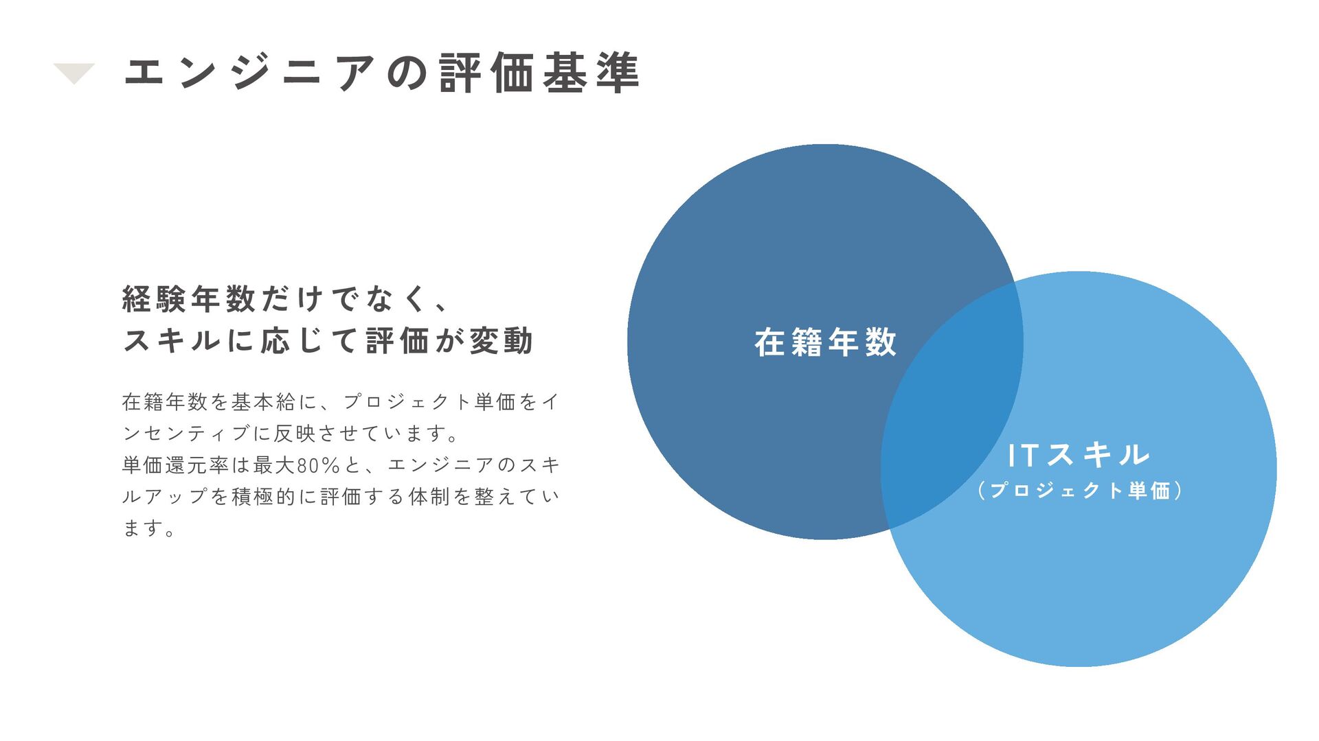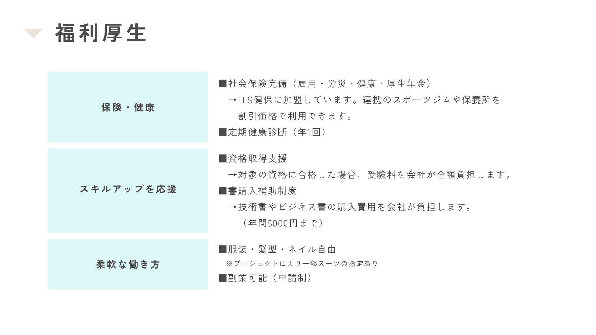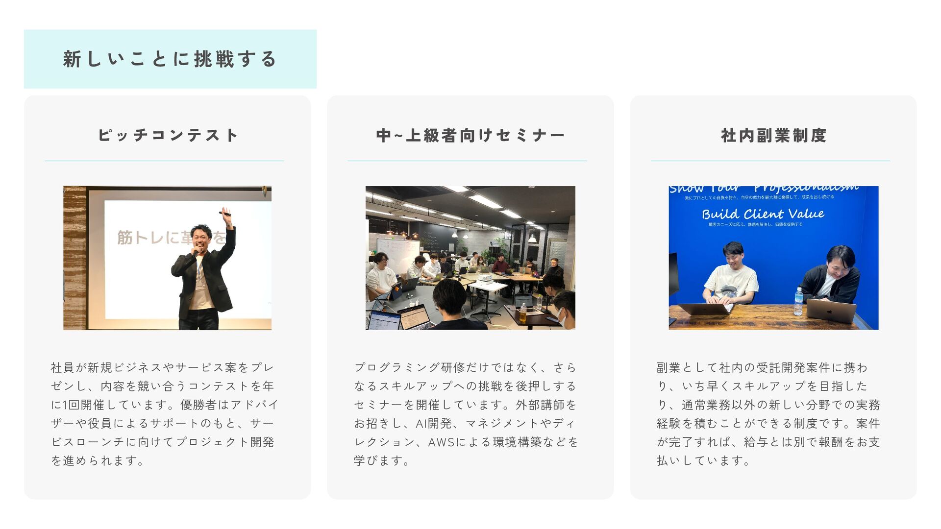 ー 社 内 副 業 制 度 ピ ッ チ コ ン テ ス ト 社員が新規ビジネスやサービス案をプレ ゼンし、内容を競い合うコンテストを年 に1回開催しています。優勝者はアドバイ ザーや役員によるサポートのもと、サー ビスローンチに向けてプロジェクト開発 を進められます。 プログラミング研修だけではなく、さら なるスキルアップへの挑戦を後押しする セミナーを開催しています。外部講師を お招きし、AI開発、マネジメントやディ レクション、AWSによる環境構築などを 学びます。 副業として社内の受託開発案件に携わ り、いち早くスキルアップを目指した り、通常業務以外の新しい分野での実務 経験を積むことができる制度です。案件 が完了すれば、給与とは別で報酬をお支 払いしています。 新しいことに挑戦する