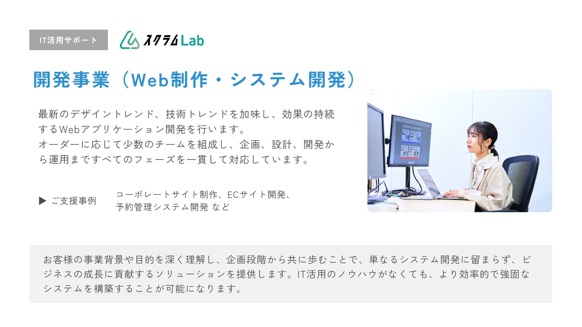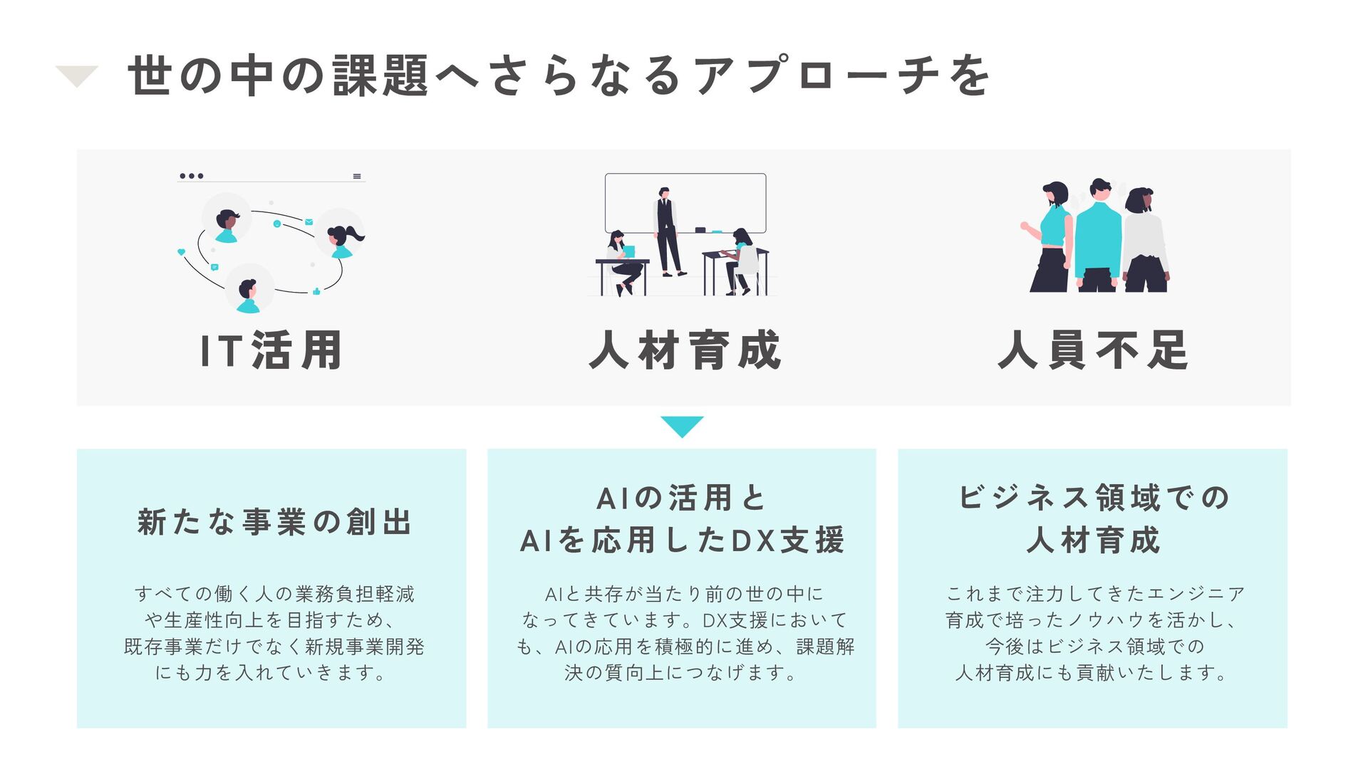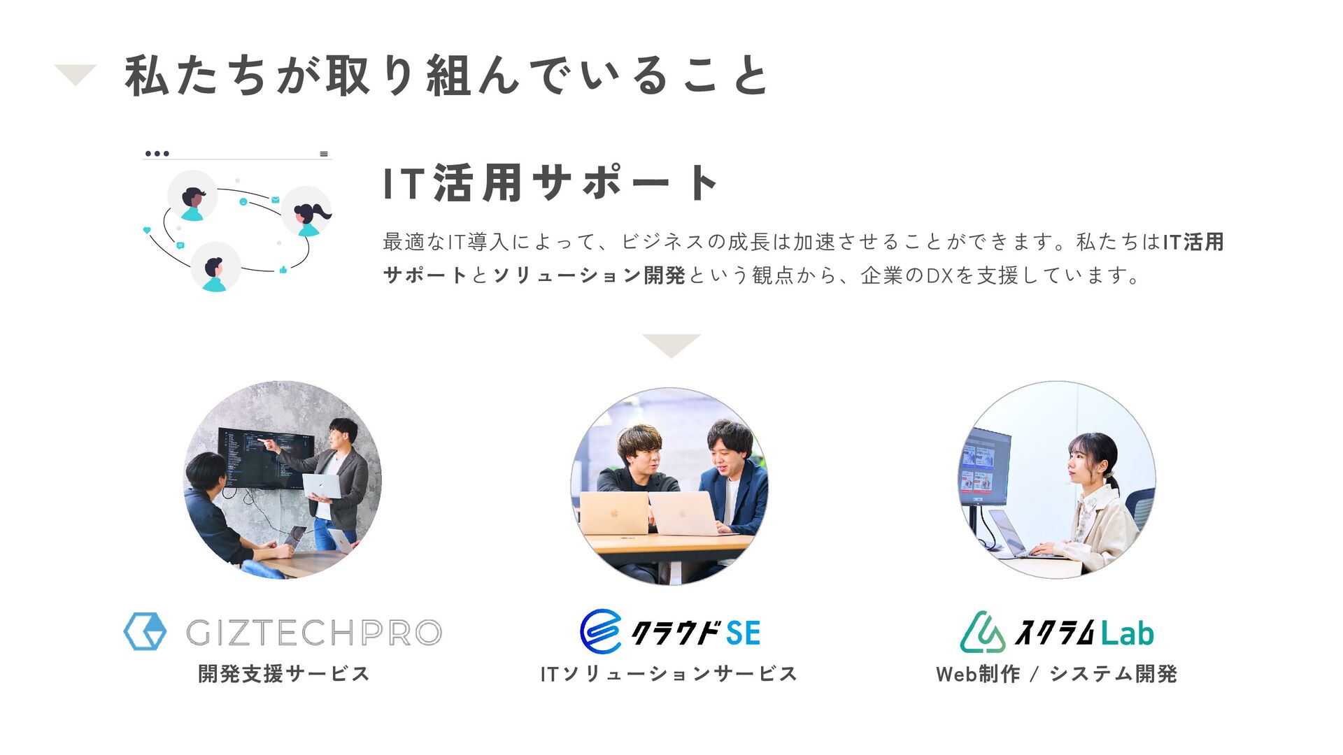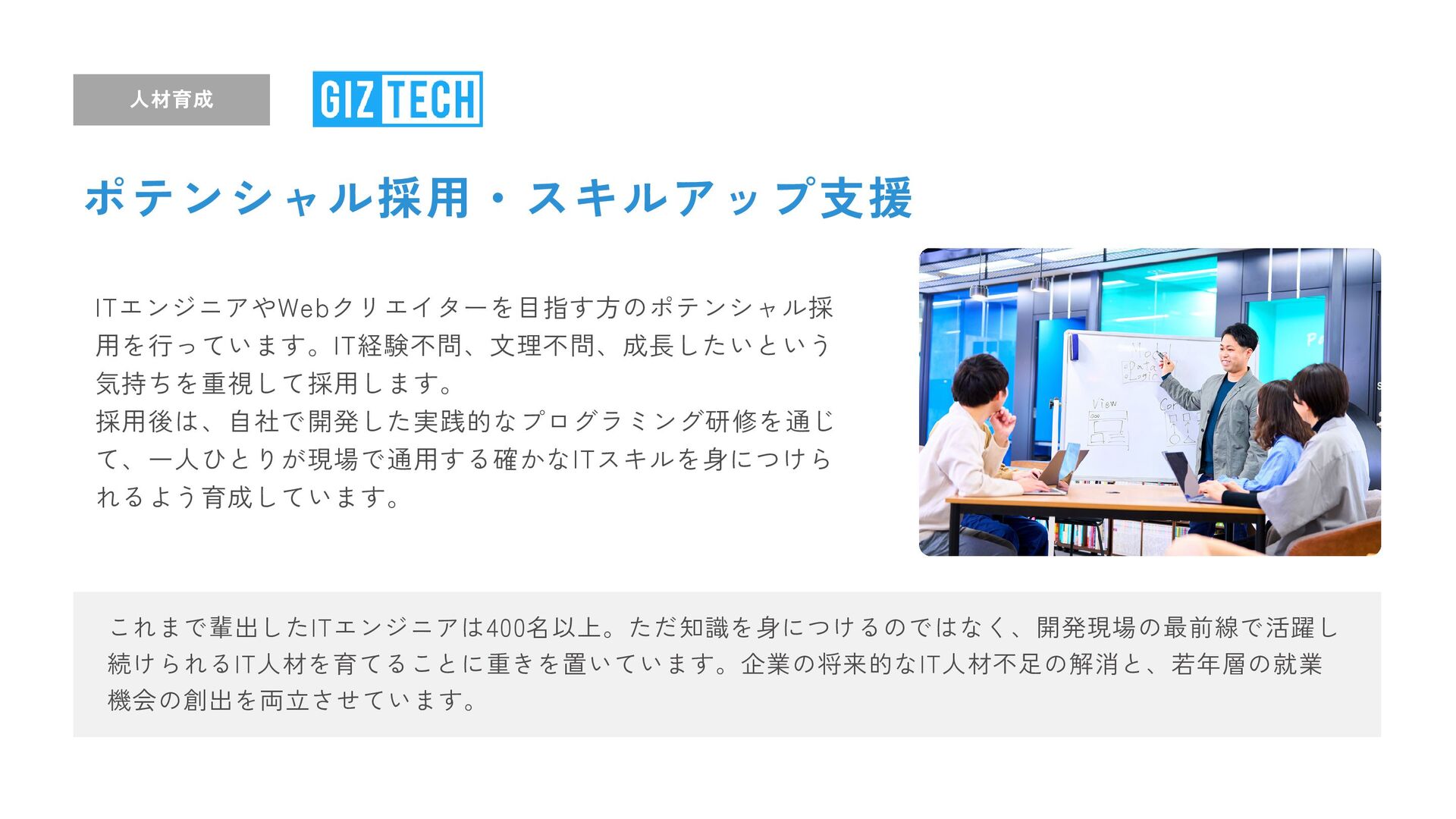ー 社 内 副 業 制 度 ピ ッ チ コ ン テ ス ト 社員が新規ビジネスやサービス案をプレ ゼンし、内容を競い合うコンテストを年 に1回開催しています。優勝者はアドバイ ザーや役員によるサポートのもと、サー ビスローンチに向けてプロジェクト開発 を進められます。 プログラミング研修だけではなく、さら なるスキルアップへの挑戦を後押しする セミナーを開催しています。外部講師を お招きし、AI開発、マネジメントやディ レクション、AWSによる環境構築などを 学びます。 副業として社内の受託開発案件に携わ り、いち早くスキルアップを目指した り、通常業務以外の新しい分野での実務 経験を積むことができる制度です。案件 が完了すれば、給与とは別で報酬をお支 払いしています。 新しいことに挑戦する