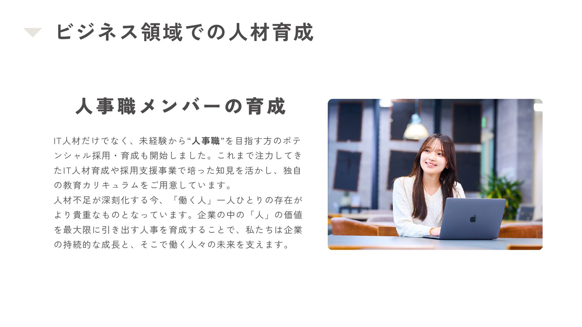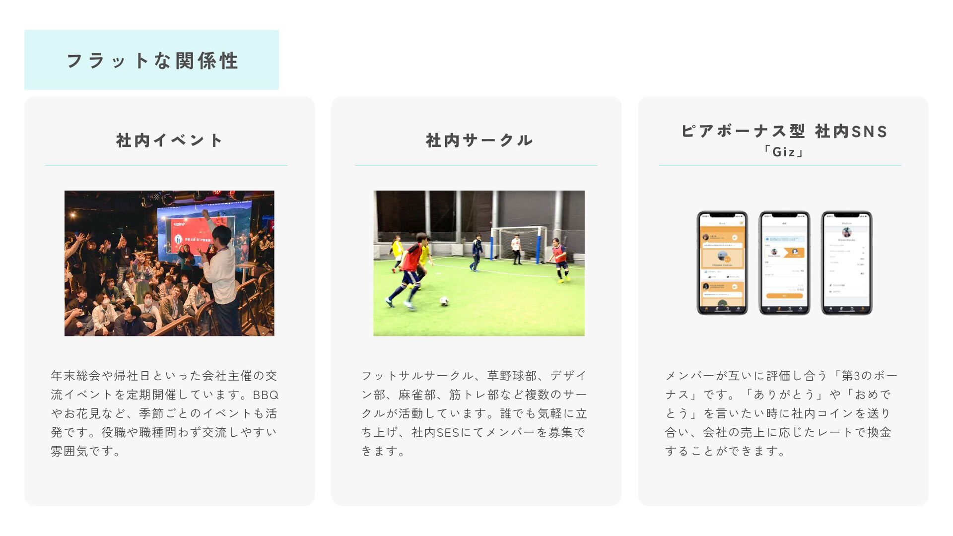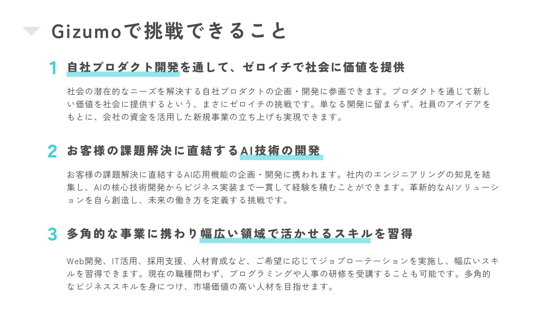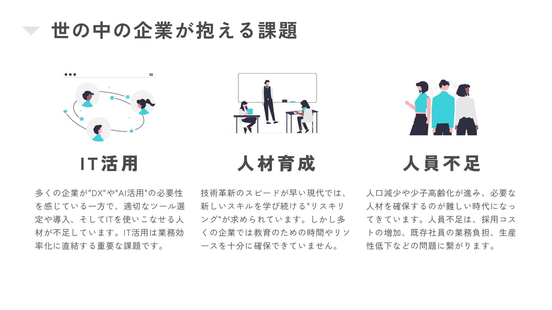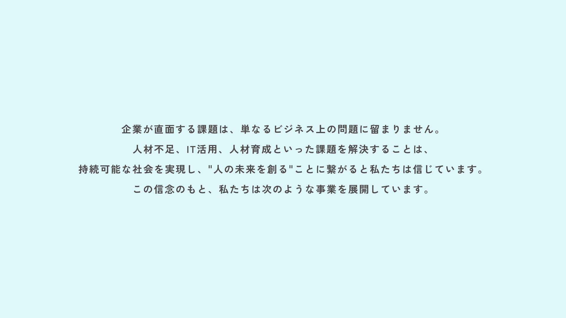 ー 社 内 副 業 制 度 ピ ッ チ コ ン テ ス ト 社員が新規ビジネスやサービス案をプレ ゼンし、内容を競い合うコンテストを年 に1回開催しています。優勝者はアドバイ ザーや役員によるサポートのもと、サー ビスローンチに向けてプロジェクト開発 を進められます。 プログラミング研修だけではなく、さら なるスキルアップへの挑戦を後押しする セミナーを開催しています。外部講師を お招きし、AI開発、マネジメントやディ レクション、AWSによる環境構築などを 学びます。 副業として社内の受託開発案件に携わ り、いち早くスキルアップを目指した り、通常業務以外の新しい分野での実務 経験を積むことができる制度です。案件 が完了すれば、給与とは別で報酬をお支 払いしています。 新しいことに挑戦する