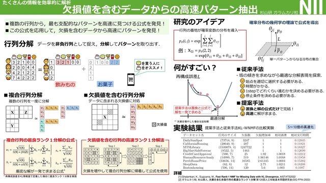 最適分解 [1] Ghalamkari, K., Sugiyama, M., Fast Rank-1 NMF for Missing Data with KL Divergence, AISTATS2022 [2] ガラムカリ和, 杉山麿人, 欠損を含む非負行列の高速なランク1分解 第120回人工知能基本問題研究会(SIG-FPAI 2022) ・坂の傾きを求めながら最適な分解表現を探索. 始点を適切に選択する必要がある. 時間がかかる. 1stepでどれくらい進むかを決める必要がある. 停止条件を決める必要がある. 実験結果 ▪従来手法 飲みもの お菓子 研究のアイデア 欠損値を含む行列の高速ランク1分解法 複合行列の最良ランク1分解の公式 欠損を増やして複合行列分解に帰着して公式を使用 厳密な解が一発で求まる公式* 複数の行列を一度に分解 データに含まれる欠損値に対処 ▪欠損値を含む行列分解 ▪提案手法 置換と解の公式だけで完結! 高速に解が求まる. * 再構成誤差をKL情報量で定義した場合に最良ランク1分解を実現 提案手法は置換と公式で 解を一発で求める** ** 欠損を増やした場合は近似解 🍵を買う人に ☕をオススメ! 例: 行列の番地が確率変数の分布を導入 単一パターンからなる分布の集合 確率分布の幾何学の理論で公式を導出 詳細 5~10倍の高速化 提案手法と従来手法KL-WNMFの比較実験 たくさんの情報を効率的に解析