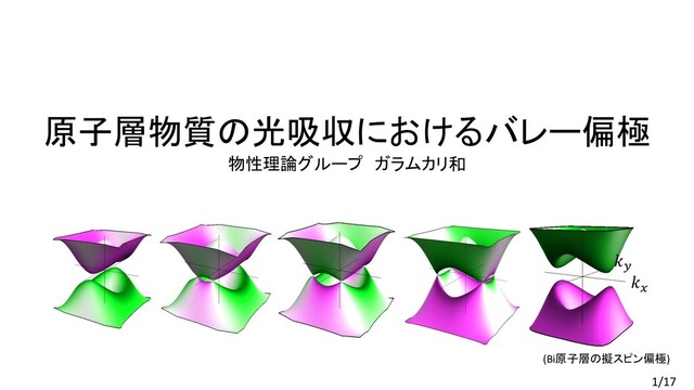 −λ𝑆𝑂 − 𝑉 0 −λ𝑅 λ𝑅 ∗ 0 −λ𝑆𝑂 + 𝑉 𝑡 0 −λ𝑅 ∗ 𝑡∗ λ𝑆𝑂 − 𝑉 A↑ B↑ A↓ B↓ A↑ B↑ A↓ B↓ 𝑧 電場𝑬𝒛 𝑦 𝑥 シリセンのハミルトニアン λ𝑆𝑂 λR 𝑥 ケイ素原子Si 𝐴 𝐵 𝑡 とびうつり積分 V 電場の効果 λ𝑆𝑂 スピン軌道相互作用 λ𝑅 ラシュバ項←無視できる 𝑉 = 𝑒𝐸𝑧 𝑑 λ𝑆𝑂 λ𝑆𝑂 λR 𝐴 𝐵 𝐻 = 𝑡 𝑖,𝑗 ,𝛼 𝑐 𝑖𝛼 † 𝑐𝑗𝛼 + 𝑖 λ𝑆𝑂 3 3 ≪𝑖𝑗≫𝛼𝛽 𝑣𝑖𝑗 𝑐 𝑖𝛼 † 𝜎𝑧 𝛼𝛽𝑐𝑖𝛼 − 𝑖 2λ𝑅 3 ≪𝑖𝑗≫𝛼𝛽 𝜇𝑖𝑗 𝑐 𝑖𝛼 † 𝝈 × 𝒅𝒊𝒋 𝒛 𝛼𝛽 𝑐𝑗𝛽 +𝑉 𝑖,𝛼 𝜁𝑖 𝑐 𝑖𝛼 † 𝑐𝑖𝛼