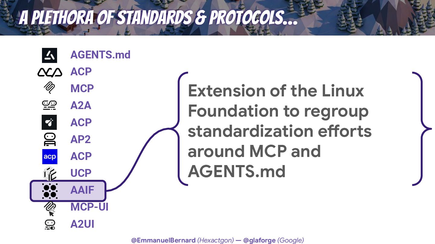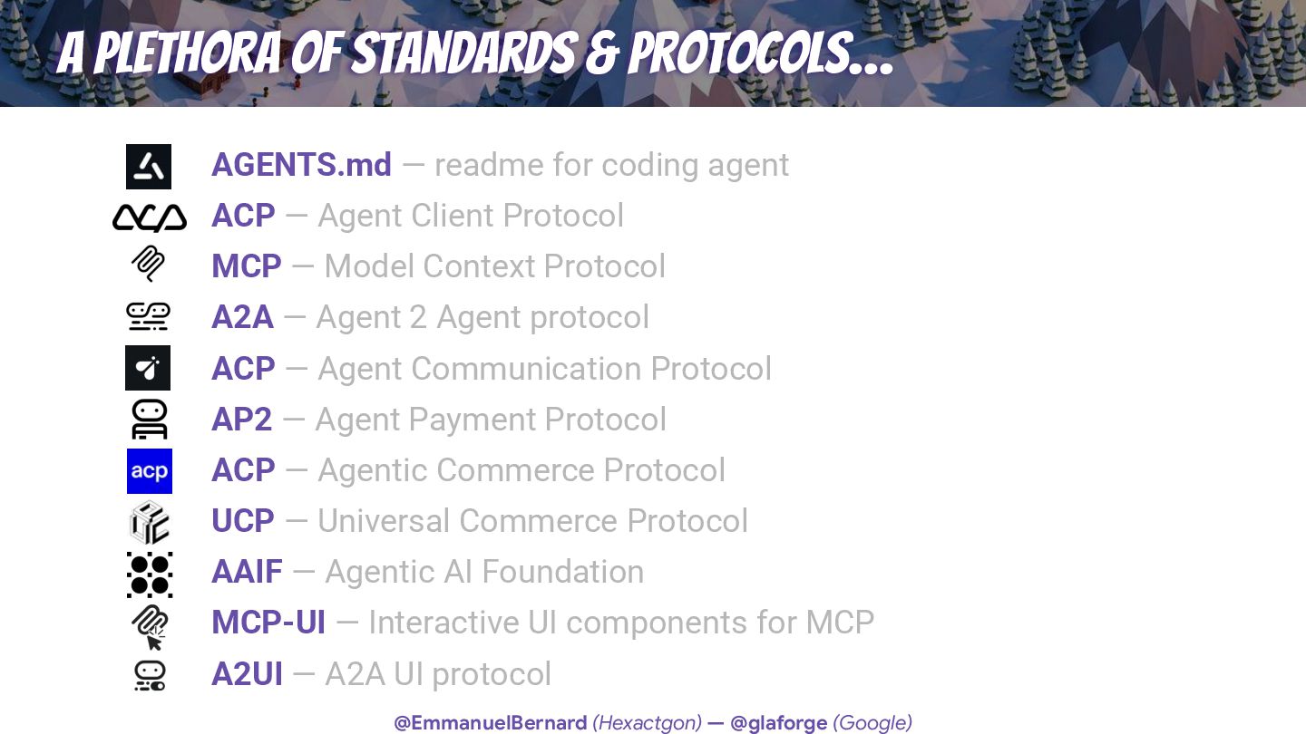 Protocols… AGENTS.md ACP MCP A2A ACP AP2 ACP UCP AAIF MCP-UI A2UI Extension of the Linux Foundation to regroup standardization efforts around MCP and AGENTS.md
