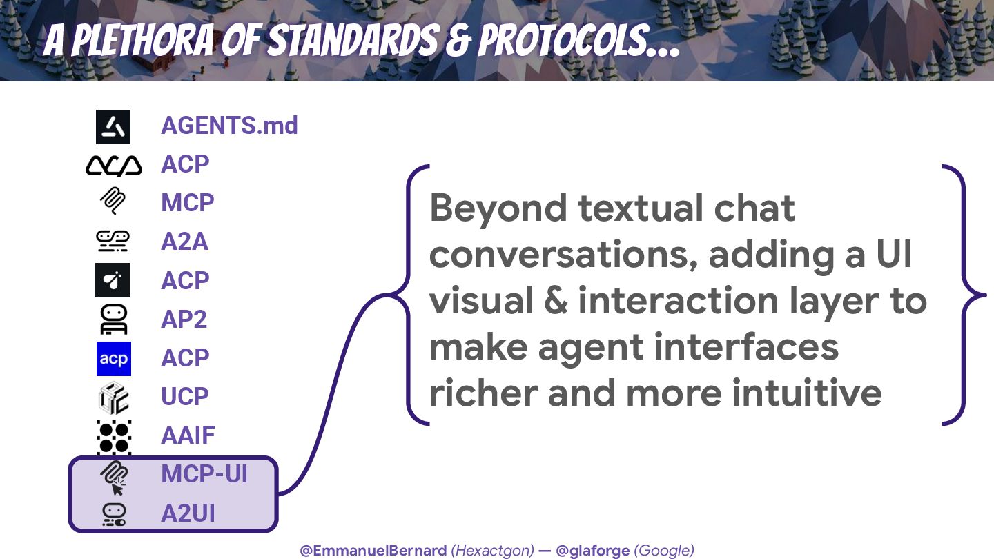 Protocols… AGENTS.md ACP MCP A2A ACP AP2 ACP UCP AAIF MCP-UI A2UI Beyond textual chat conversations, adding a UI visual & interaction layer to make agent interfaces richer and more intuitive