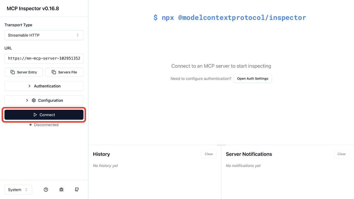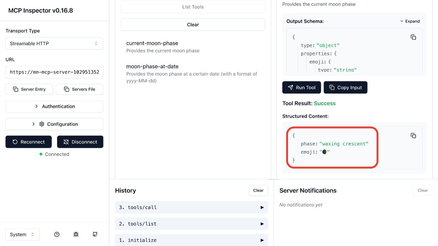 model = GoogleAiGeminiChatModel.builder() .modelName("gemini-2.5-flash") .apiKey(System.getenv("GOOGLE_API_KEY")) .build(); McpTransport transport = StreamableHttpMcpTransport.builder() .url(embeddedServer.getURI().toString() + "/mcp") .build(); McpClient mcpClient = DefaultMcpClient.builder() .key("MoonPhaseClient") .transport(transport) .build(); McpToolProvider toolProvider = McpToolProvider.builder() .mcpClients(mcpClient) .build();