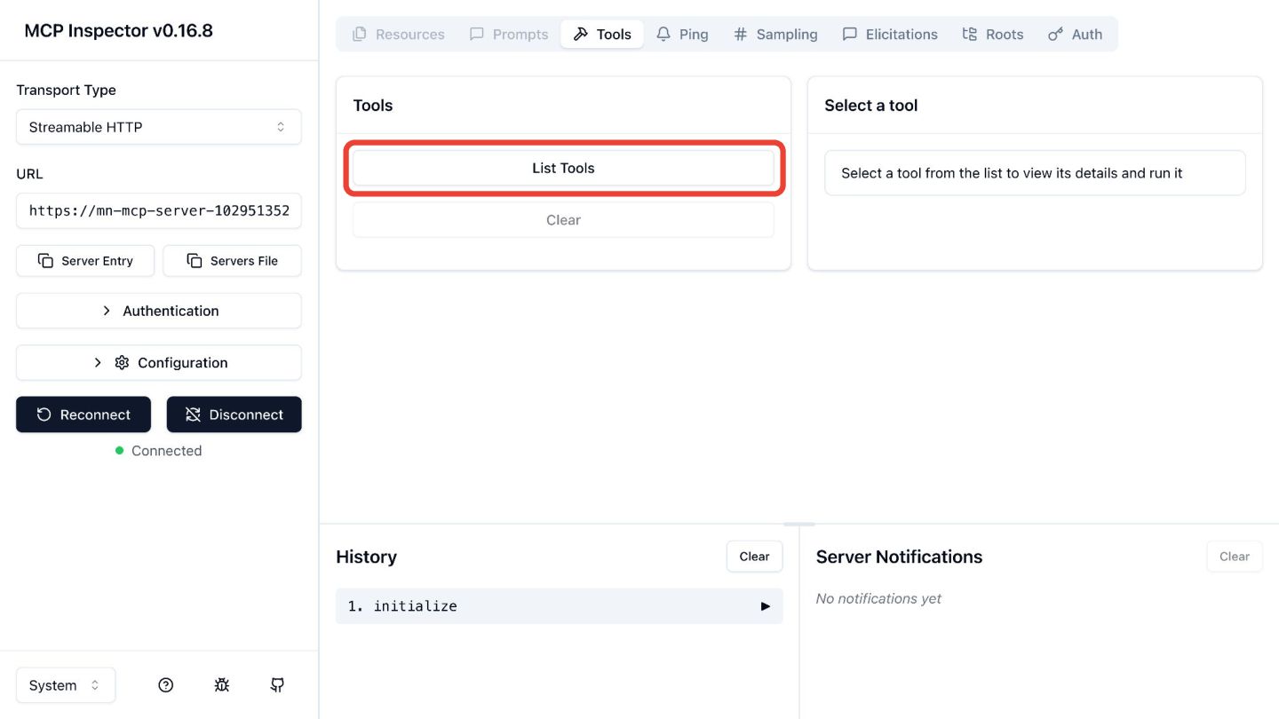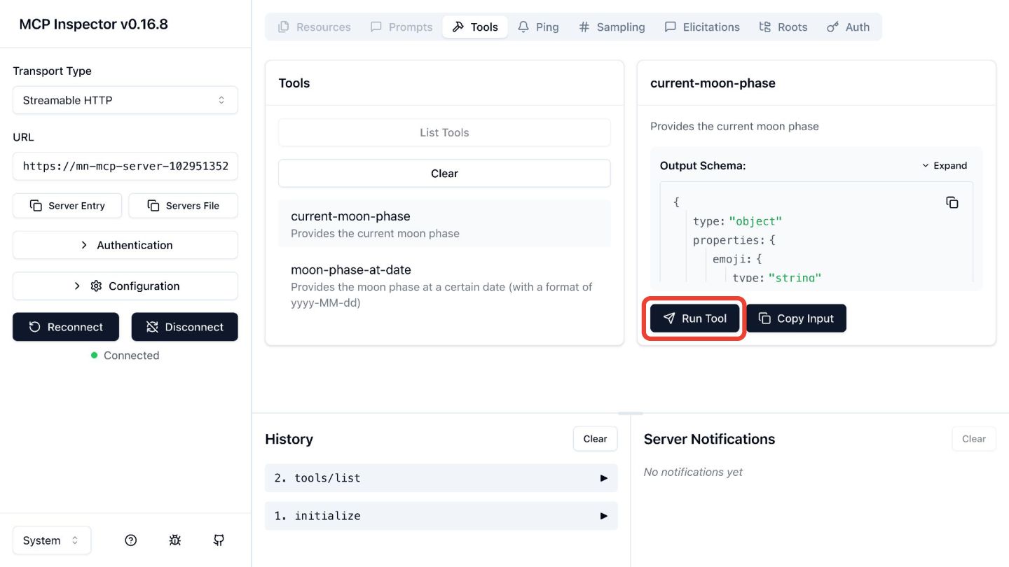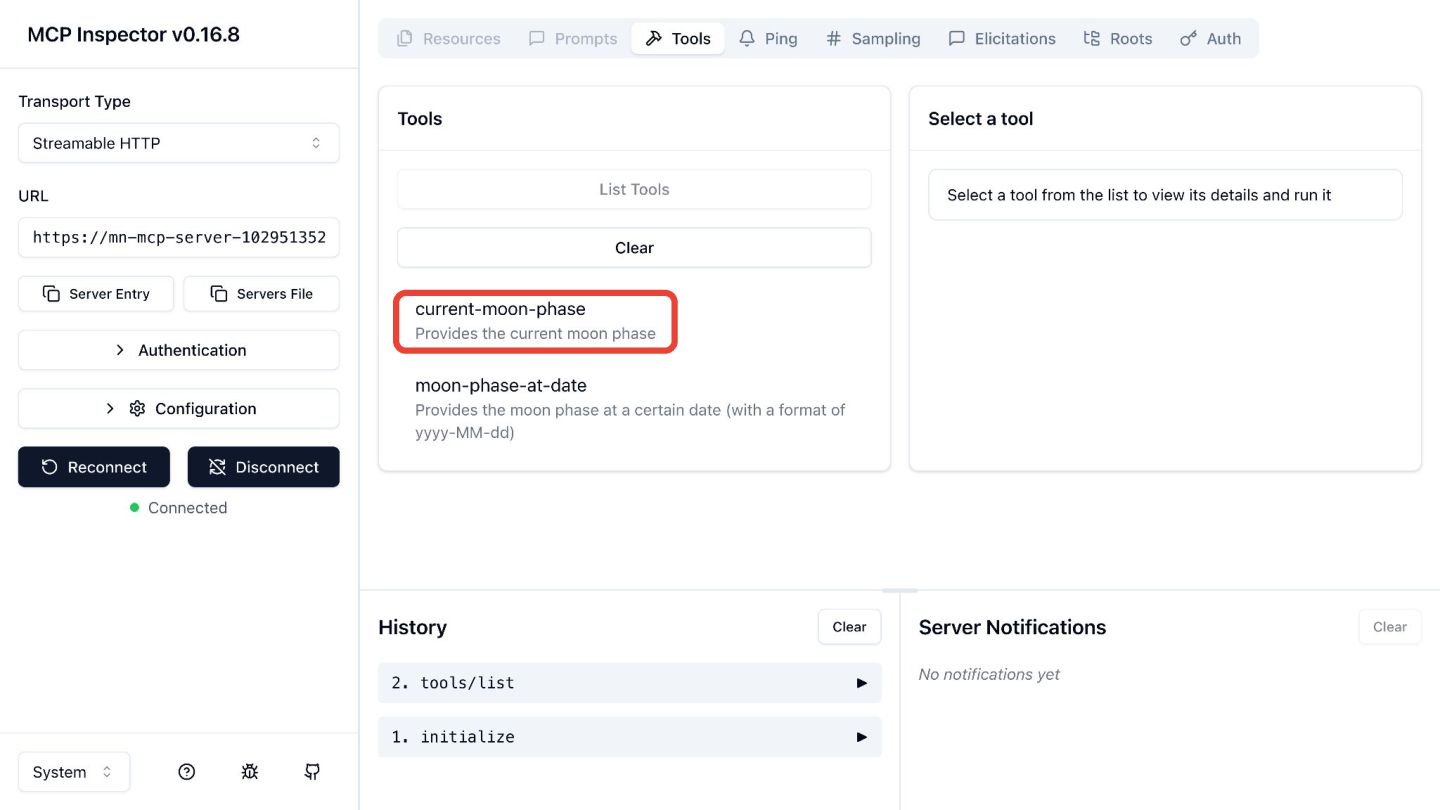 + "/mcp") .build(); McpSyncClient client = McpClient.sync(transport) .requestTimeout(Duration.ofSeconds(10)) .build(); client.initialize(); McpSchema.ListToolsResult tools = client.listTools(); McpSchema.CallToolResult result = client.callTool( new McpSchema.CallToolRequest("moon-phase-at-date", Map.of("date", "2026-01-15")) ); Tools — MCP SDK Client