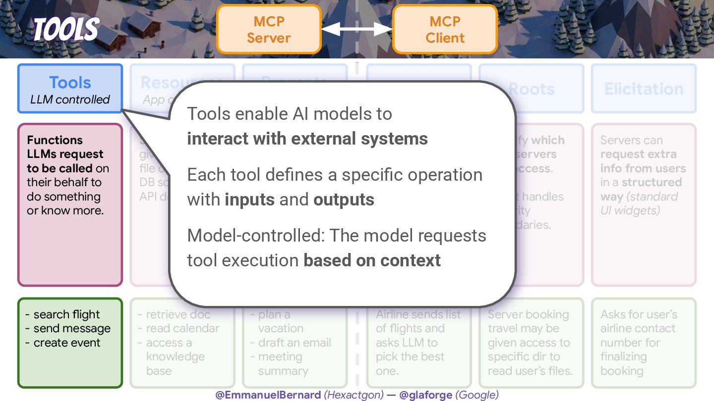 Tools LLM controlled Resources App controlled Prompts User controlled Sampling Roots Elicitation Functions LLMs request to be called on their behalf to do something or know more. Static data giving access to file contents, DB schemas, API docs. Predefined prompt templates users can use to tell the LLM how to work with tools & resources. Lets servers request LLM generation via the client. Client pays the tokens! But client controls permissions & security. Specify which files servers can access. Client handles security boundaries. Servers can request extra info from users in a structured way (standard UI widgets) - search flight - send message - create event - retrieve doc - read calendar - access a knowledge base - plan a vacation - draft an email - meeting summary Airline sends list of flights and asks LLM to pick the best one. Server booking travel may be given access to specific dir to read user’s files. Asks for user’s airline contact number for finalizing booking Tools enable AI models to interact with external systems Each tool defines a specific operation with inputs and outputs Model-controlled: The model requests tool execution based on context