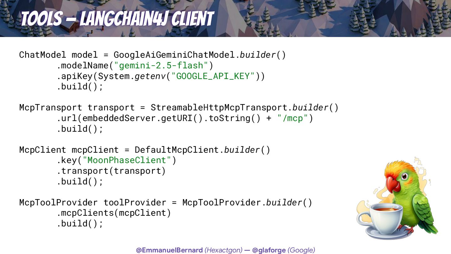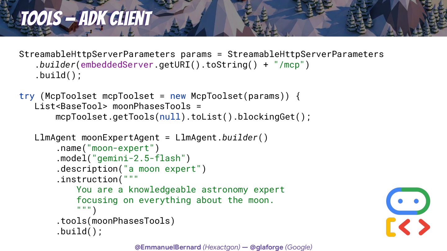 21. @EmmanuelBernard (Hexactgon) — @glaforge (Google) Tools — ADK client StreamableHttpServerParameters