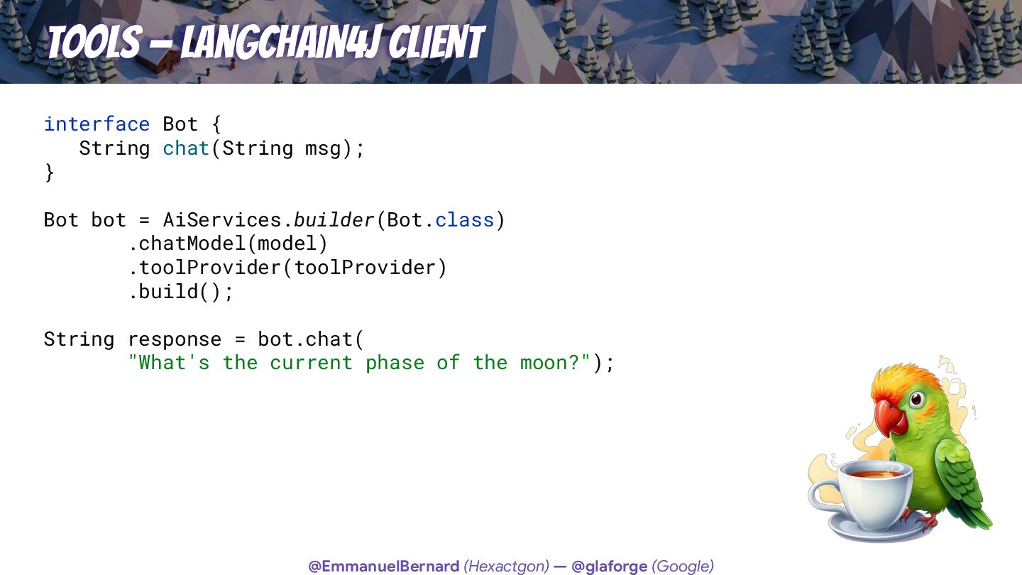 23. @EmmanuelBernard (Hexactgon) — @glaforge (Google) Tools — LangChain4j Client interface