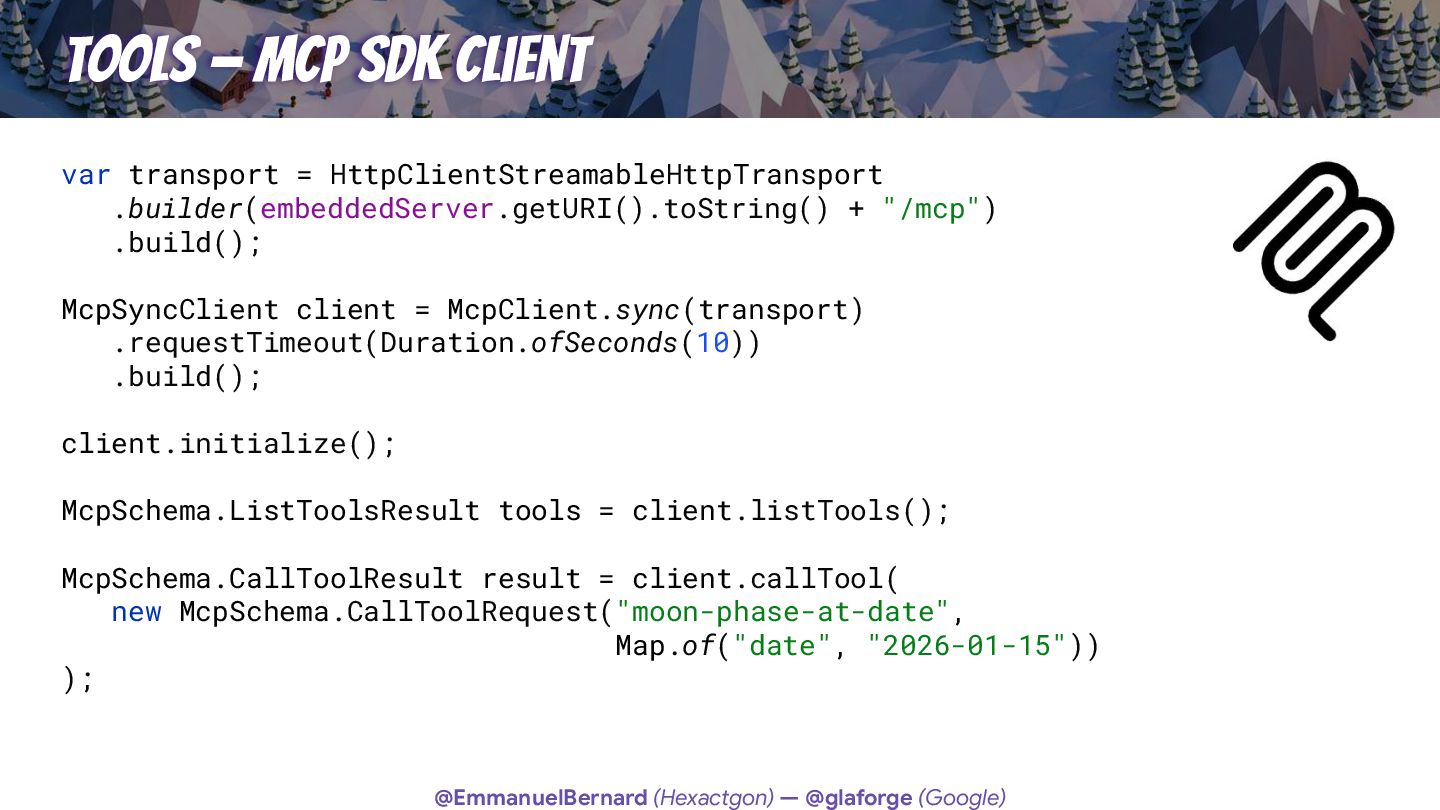 24. @EmmanuelBernard (Hexactgon) — @glaforge (Google) var transport = HttpClientStreamableHttpTransport .builder(embeddedServer.getURI().toString()
