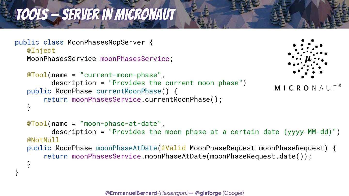 18. @EmmanuelBernard (Hexactgon) — @glaforge (Google) Tools MCP Server MCP Client