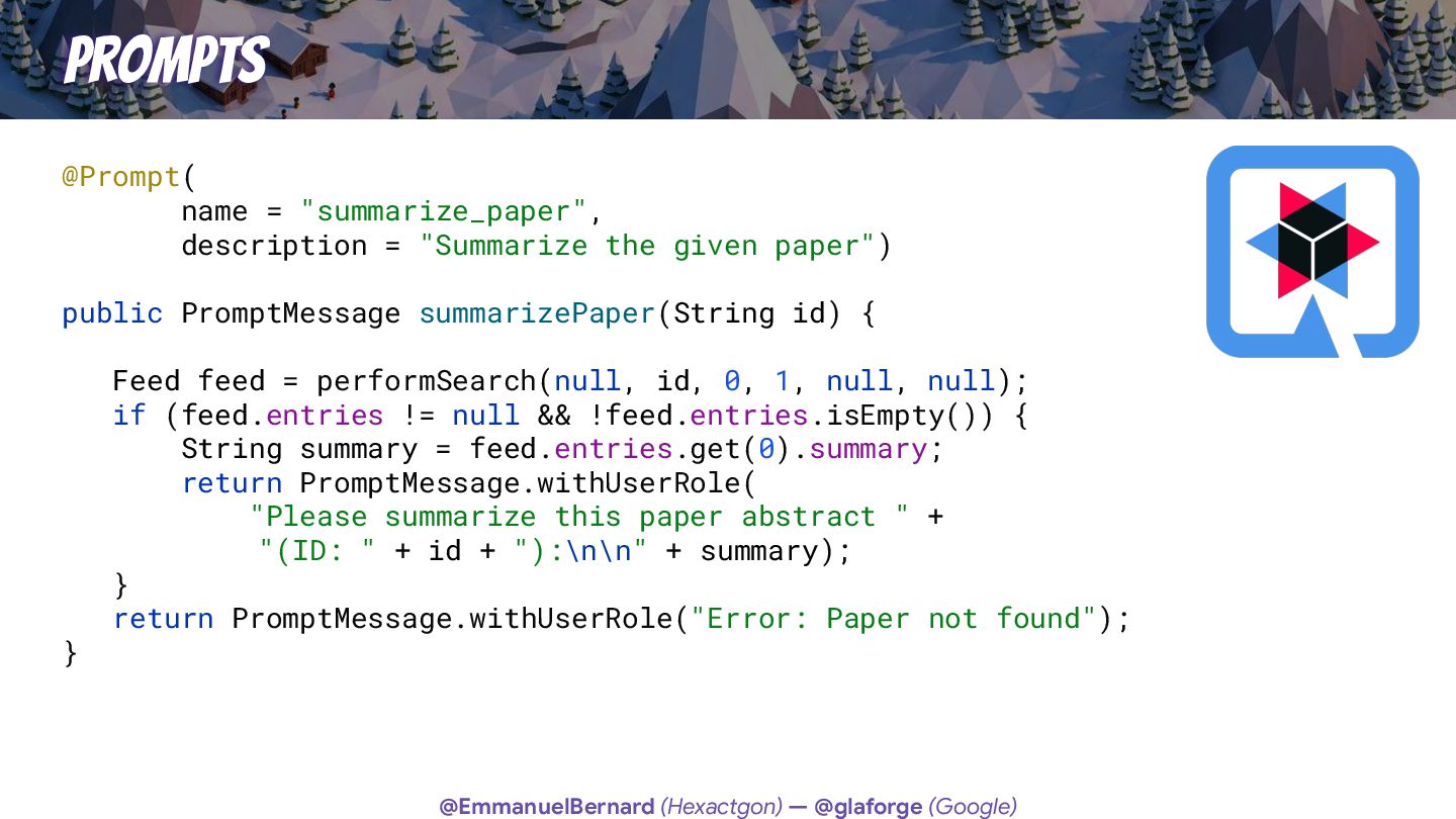 30. @EmmanuelBernard (Hexactgon) — @glaforge (Google) Prompts @Prompt( name = "summarize_paper",