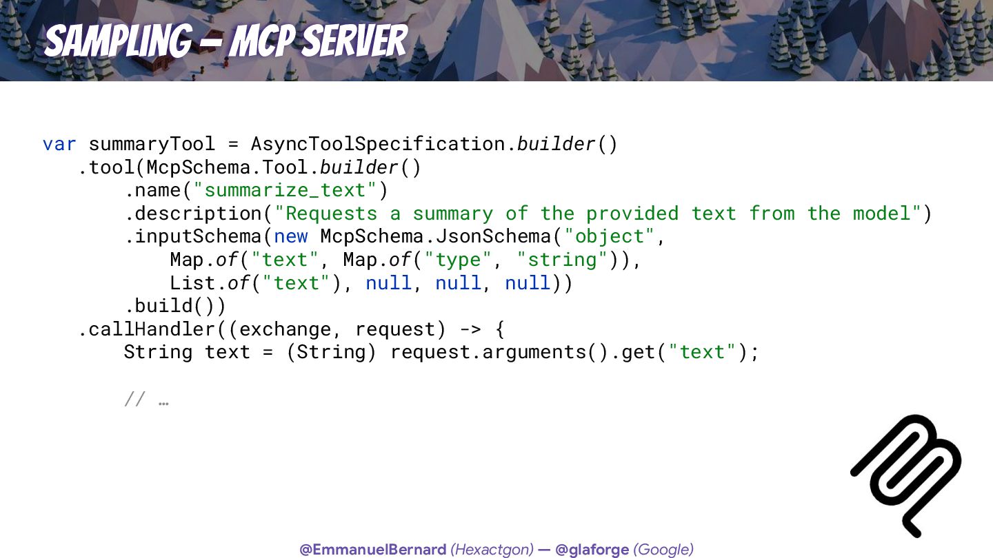 33. @EmmanuelBernard (Hexactgon) — @glaforge (Google) var summaryTool = AsyncToolSpecification.builder() .tool(McpSchema.Tool.builder()