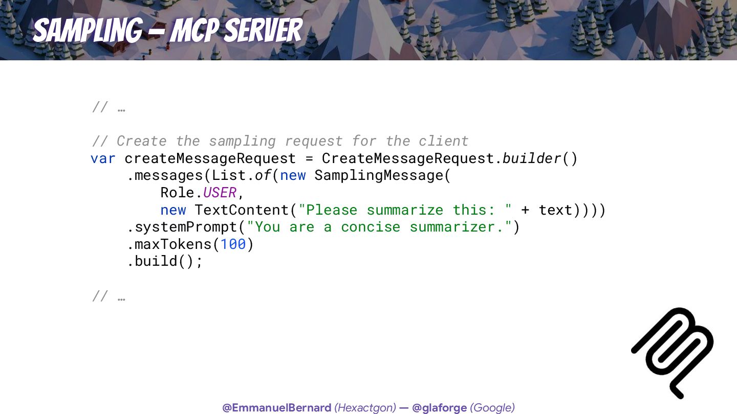 31. @EmmanuelBernard (Hexactgon) — @glaforge (Google) Sampling MCP Server MCP Client