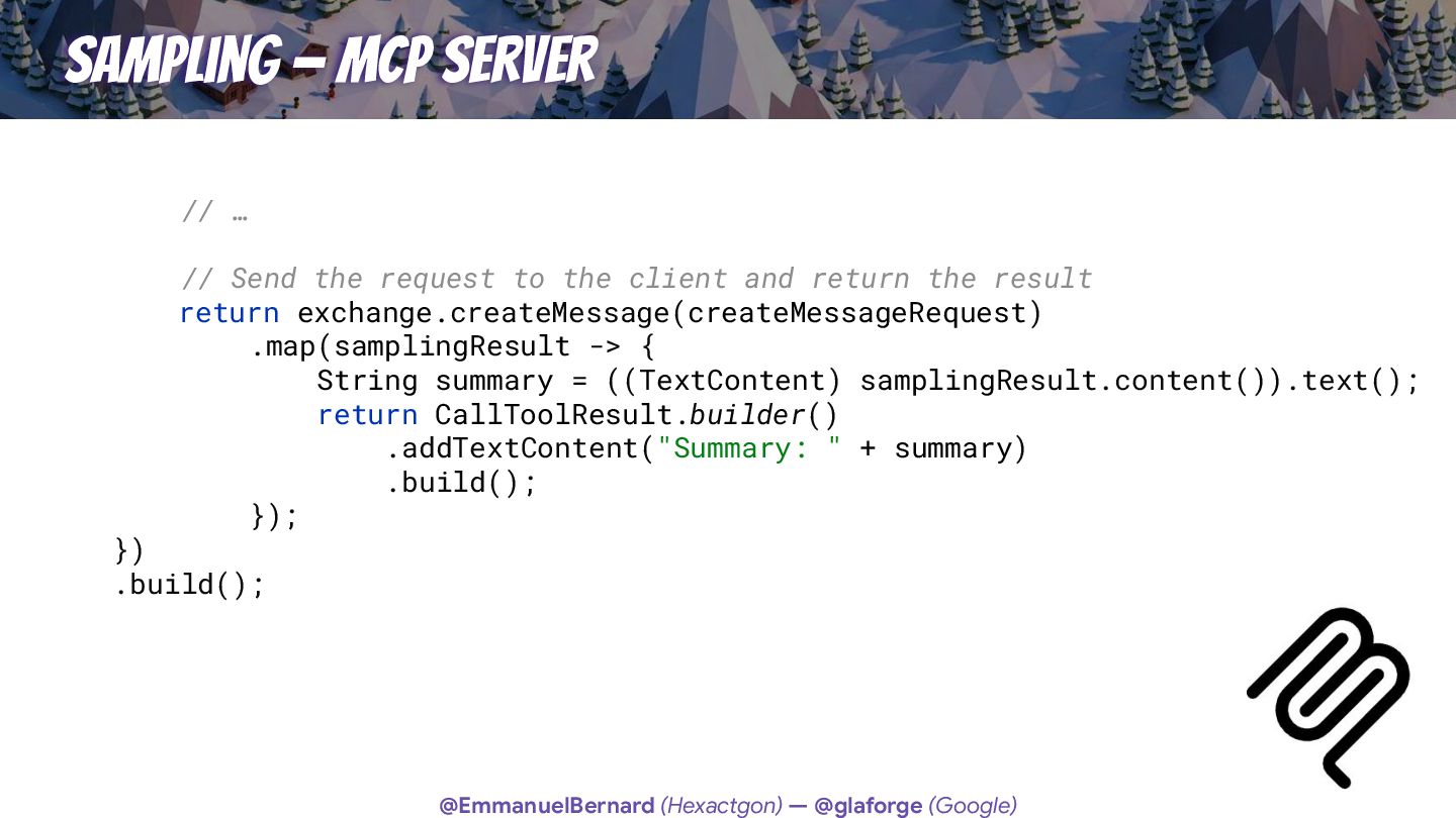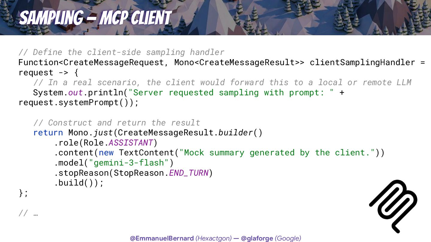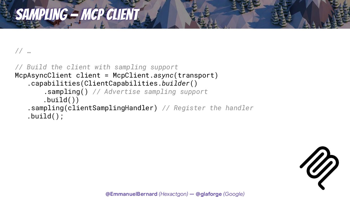 37. @EmmanuelBernard (Hexactgon) — @glaforge (Google) Sampling — MCP Client //