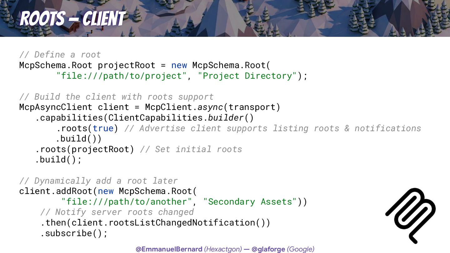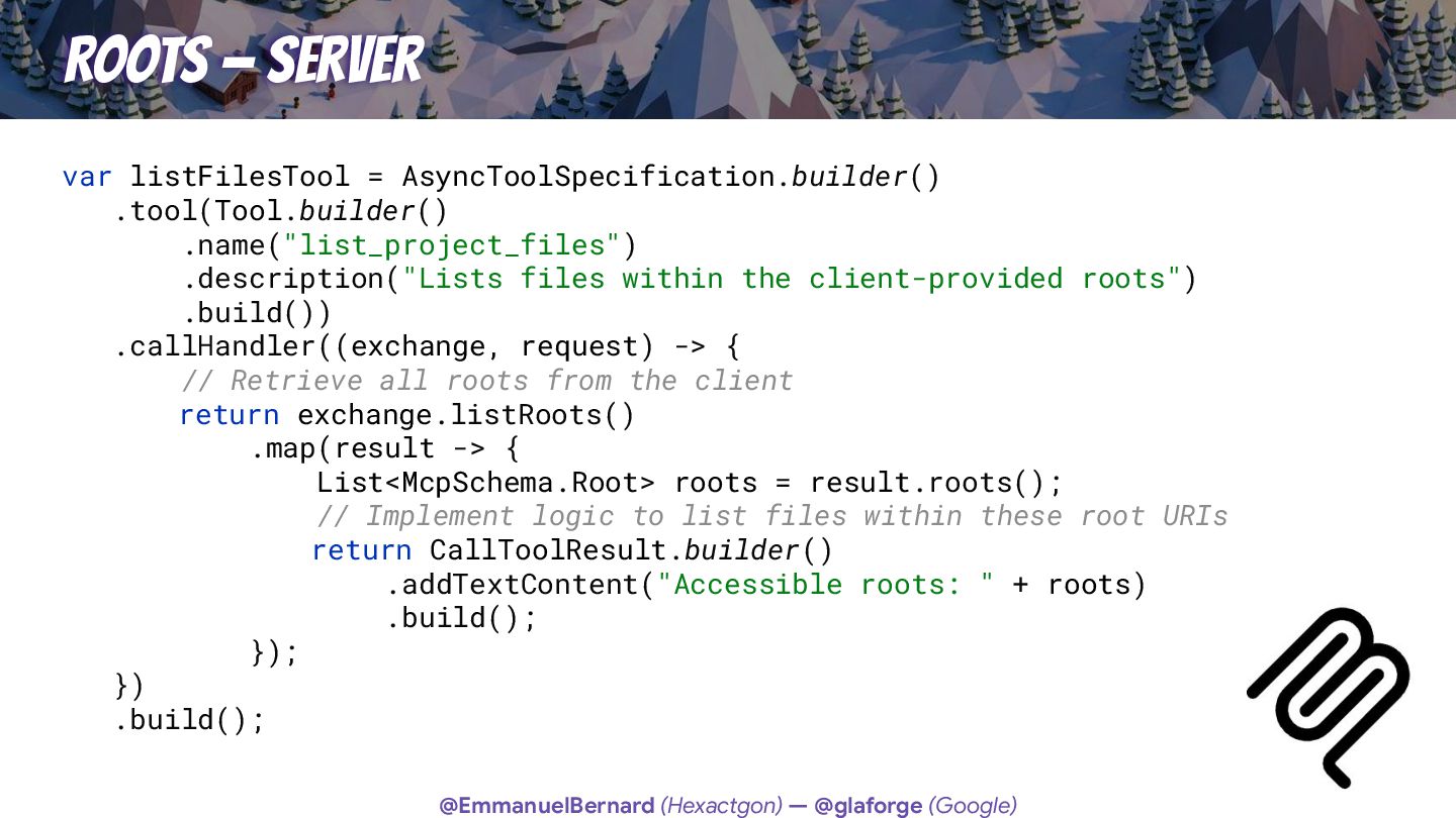 40. @EmmanuelBernard (Hexactgon) — @glaforge (Google) Roots — Server var listFilesTool