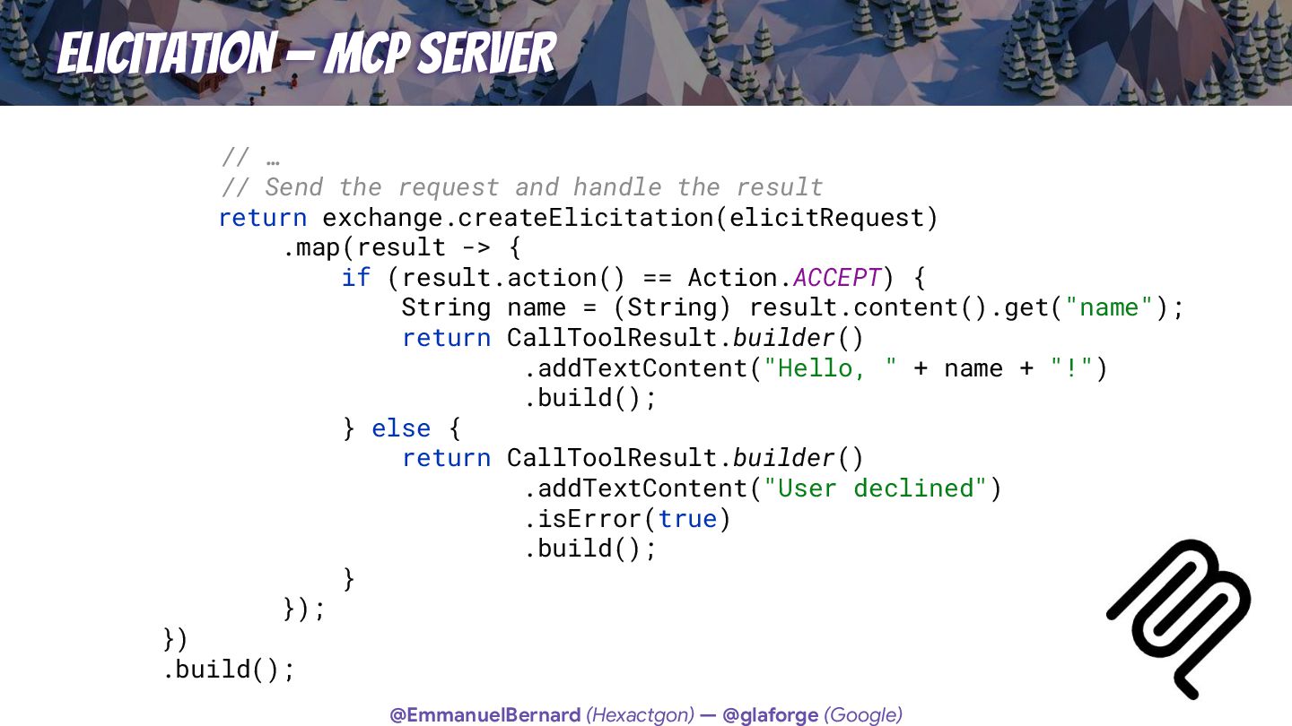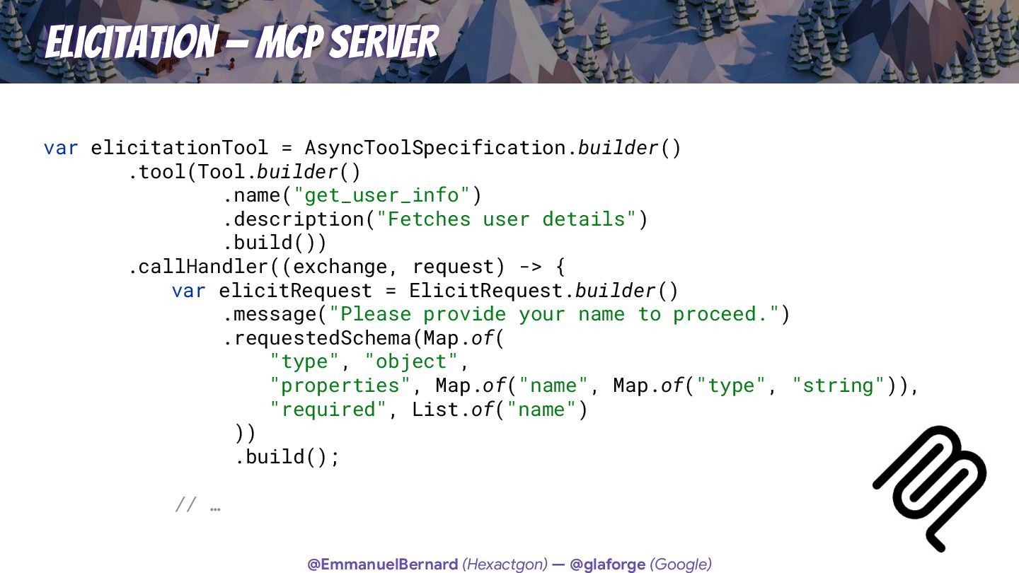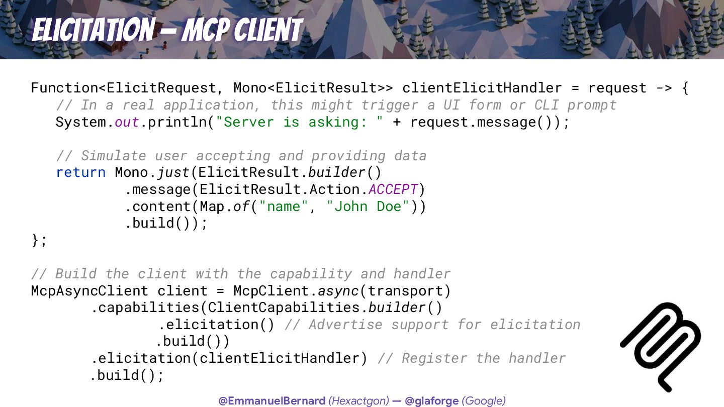 45. @EmmanuelBernard (Hexactgon) — @glaforge (Google) Elicitation — MCP Client Function<ElicitRequest,